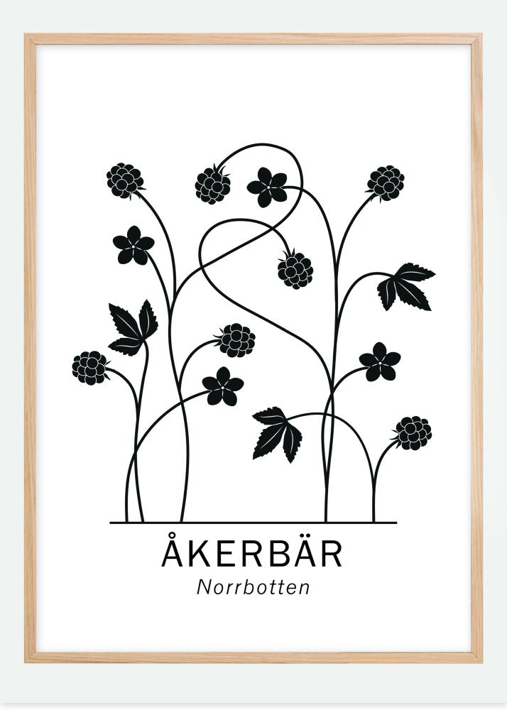 Štylizovaný plagát s moruškami v čiernej tlači. Niekoľko štylizovaných moruškových kvetov a listov sa vlní v tejto jednoduchej čierno-bielej tlači. Slová Moruška Norrbotten sú na spodku obrázka, ktorý by sa hodil na farebnú stenu, aby jej dodal ešte viac života.