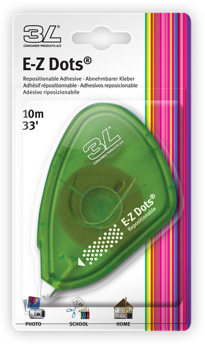 Nepermanetná fotopáska od 3L. Páska pozostáva z malých samolepiacich bodiek, ktoré sú fialové. Vďaka svojej farbe je jednoduché bodky vidieť a odstrániť, keď ste hotoví. Rolka obsahuje 10 metrov pásky so šírkou 9 mm.
