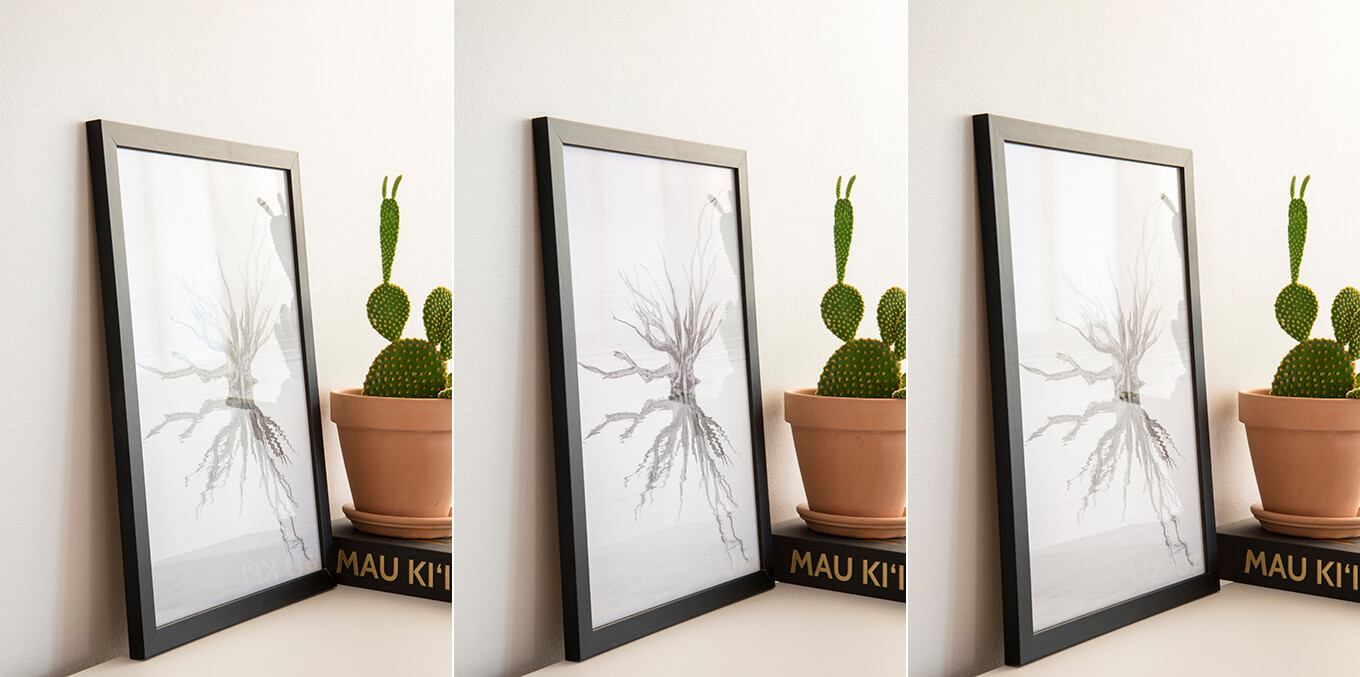 Naľavo vidíte rám s bežným sklom a napravo rám s antireflexným sklom. Rozdiel je v skutočnosti oveľa výraznejší, ale aj na týchto fotkách môžete vidieť, že motív je zreteľnejší na ráme s antireflexným sklom napravo, aj keď je prostredie veľmi svetlé.