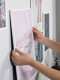 Výber rámov pomáha nastaviť tón pre nástennú galériu. Je bežné vybrať rámy v jednej alebo dvoch farbách, aby boli všetky obrazy na stene prirodzene zladené. Ak hľadáte dramatickejší efekt, môžete s výhodou zvoliť opačný prístup a kombinovať a miešať obrazy v rámoch úplne rôznych farieb, tvarov a prevedení.