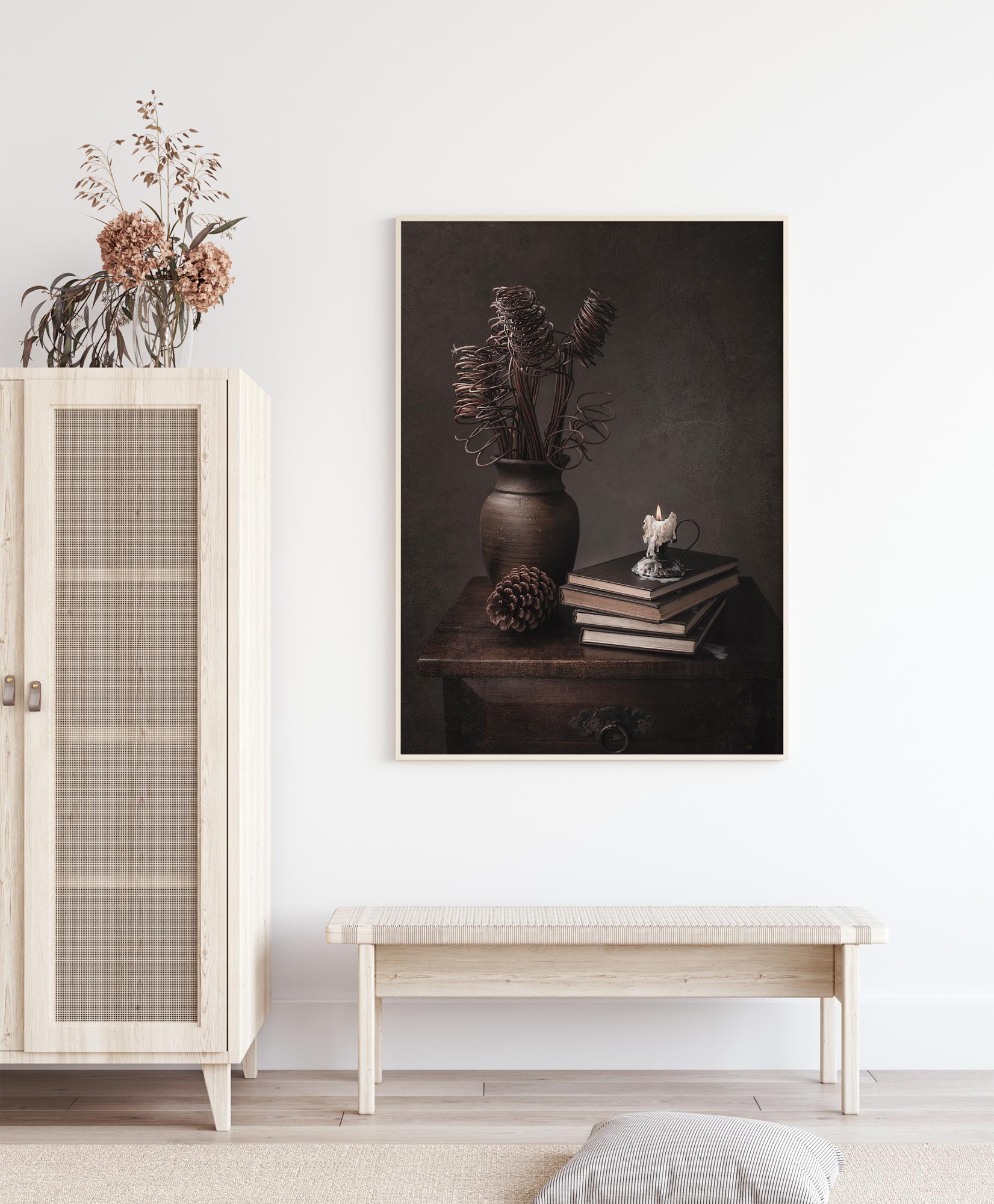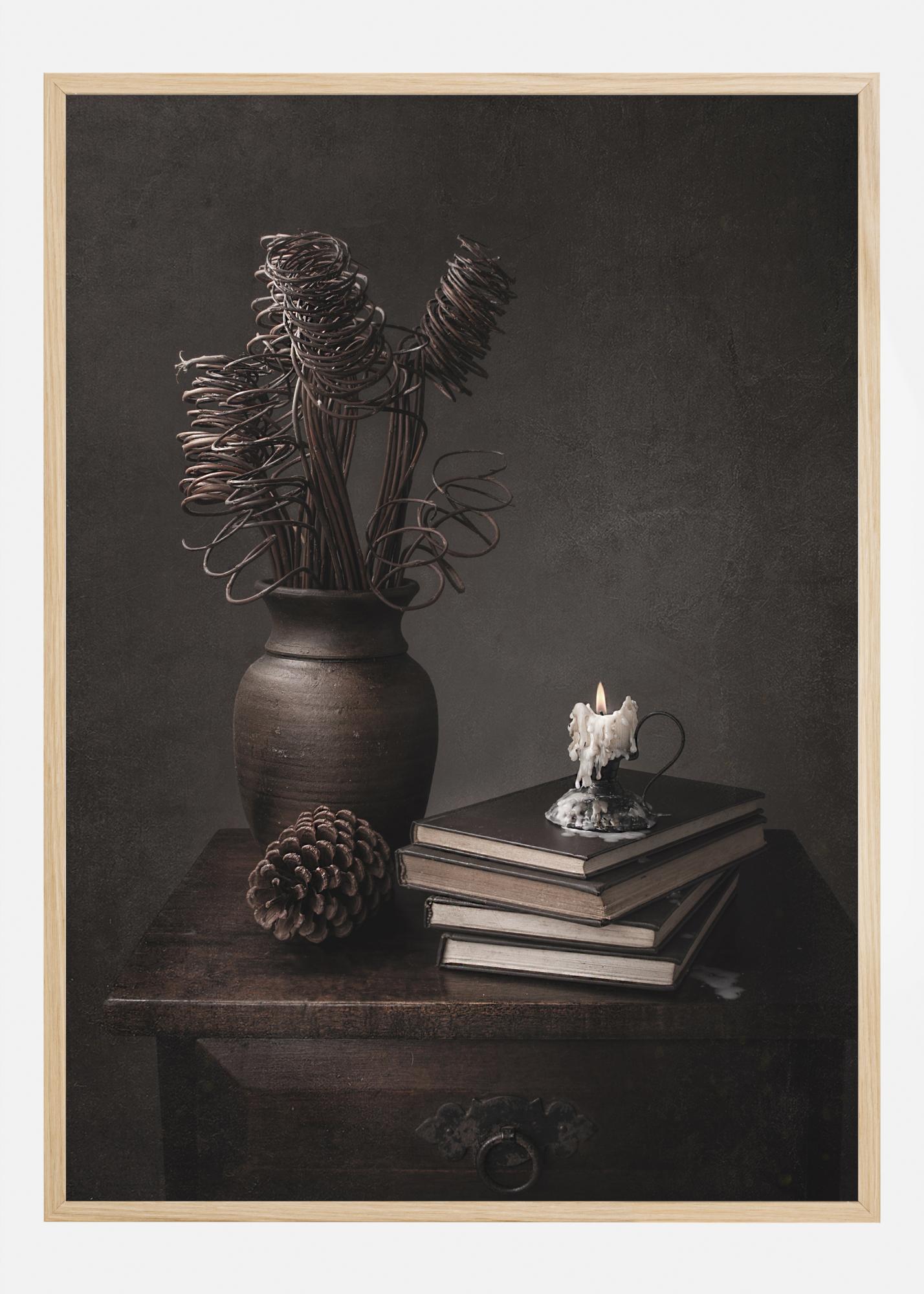 Dramatický zátišie plagát s kanvicou, šiškou, knihami a sviečkou na starom príborníku. Špirály suchej rastliny priťahujú pohľad k topiacemu sa vosku a plameňu sviečky. Tmavé sépiové farby dávajú mystický pocit času z minulosti.