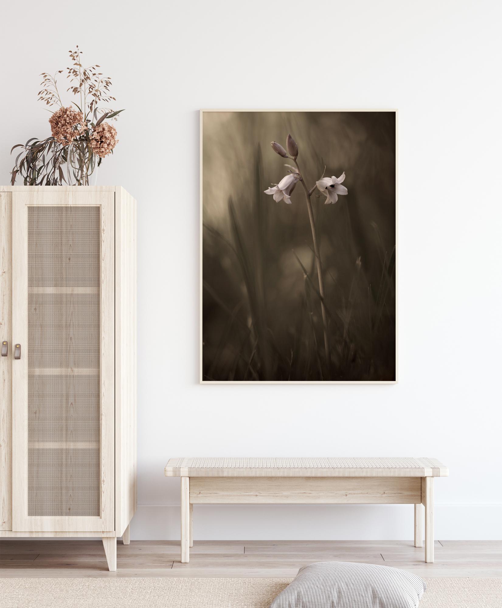 Mäkký plagát s bielym kvetom na rozostrenom pozadí. Biele a ružové zvončekové kvety kontrastujú s mäkkým trávnatým poľom za nimi. Skombinujte tento jednoduchý plagát s tónmi zelenej s svetlou stenou, aby kvety ešte viac vynikli na tomto diskrétnom plagáte.