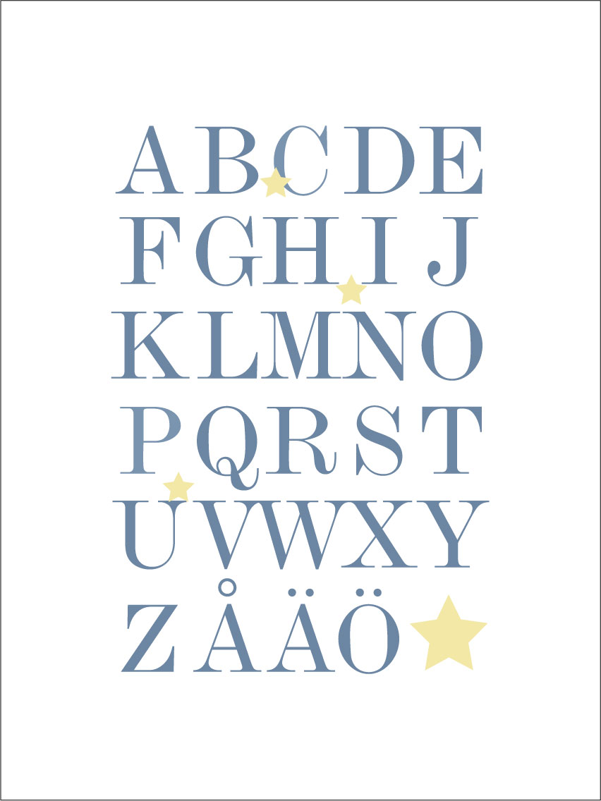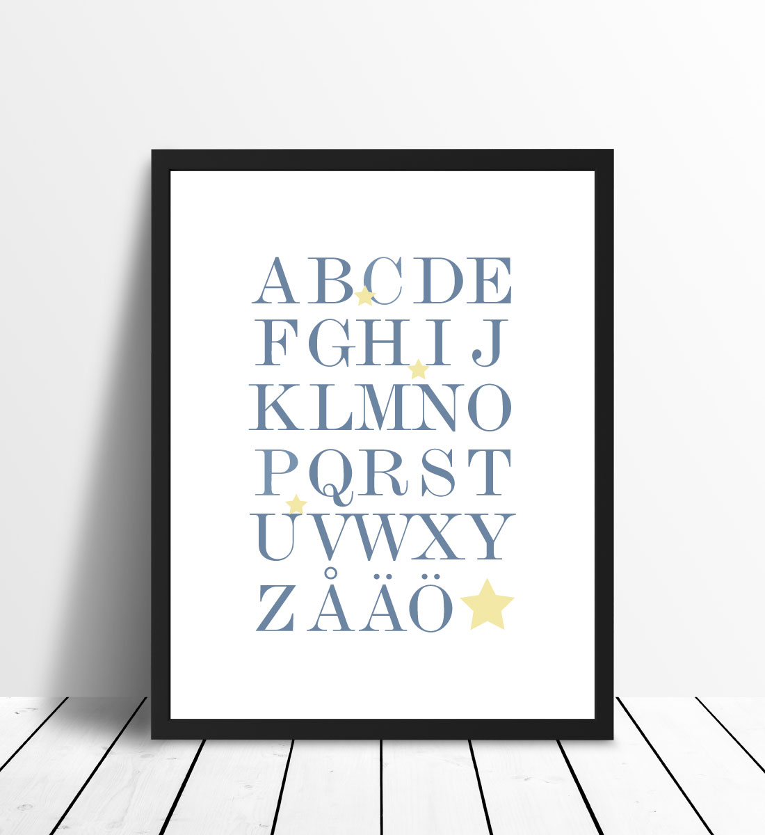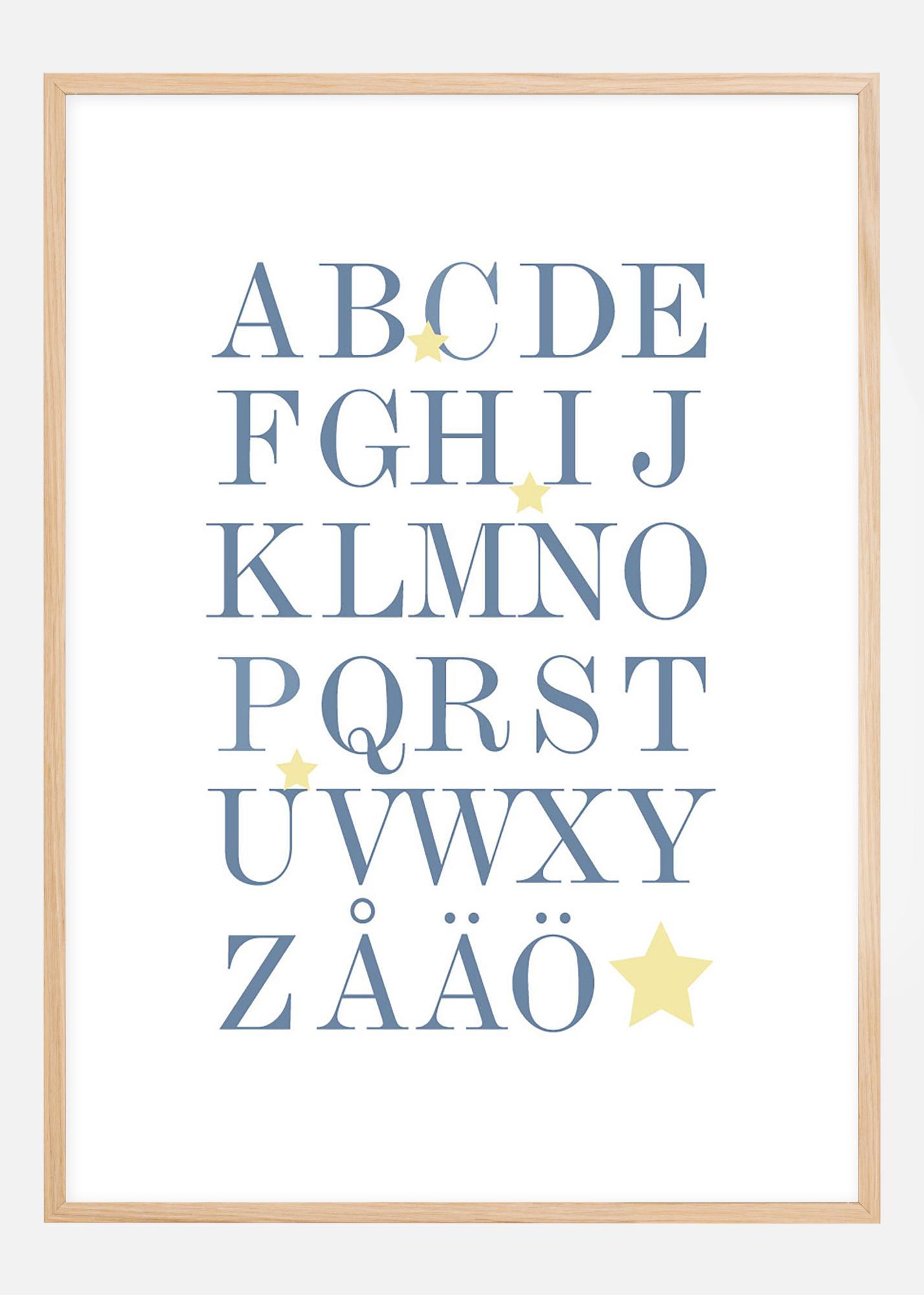 Plagát s celou abecedou, A-Ö, v modrej farbe a hviezdami v béžovej farbe. Pedagogický motív je vhodný do detskej izby na učenie abecedy, ale aj na iné steny v dome. Elegantný výraz umožňuje, že plagát sa hodí do všetkých štýlov interiéru a typov domov. Skombinujte ho s inými obrazmi na nástennú stenu s jednou témou alebo ozdobte stenu spolu s plagátom s číslami 1-10.