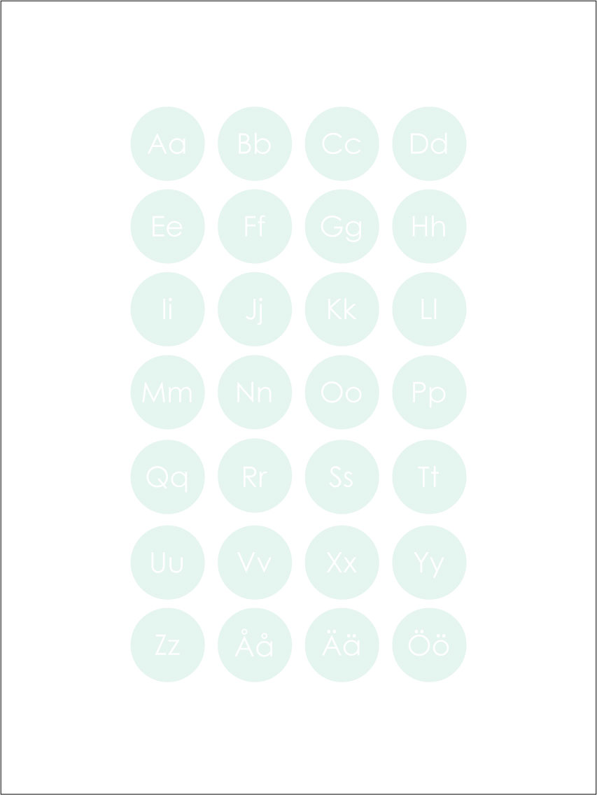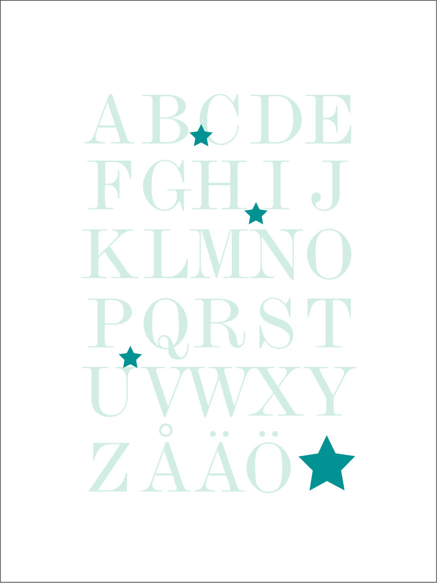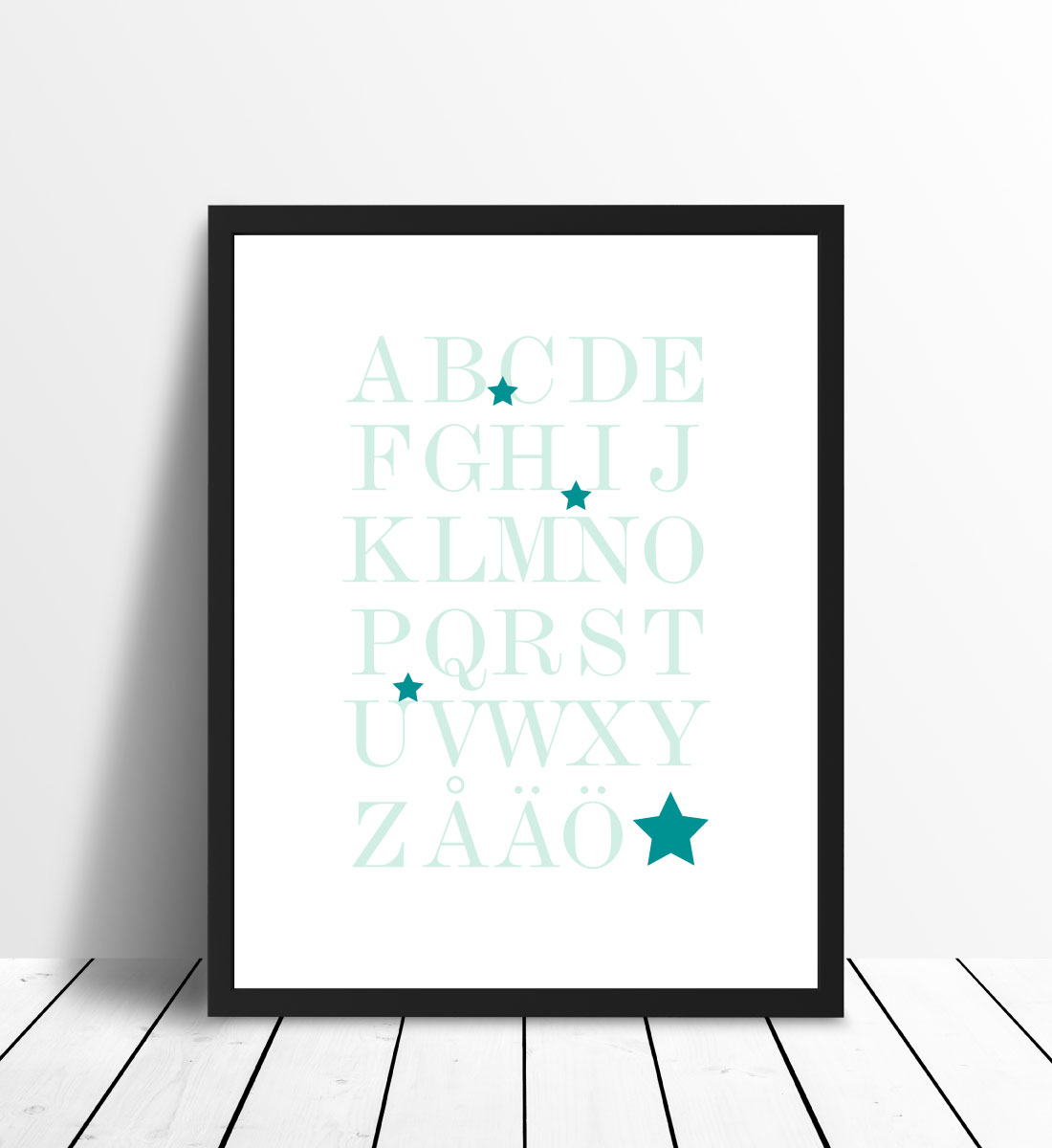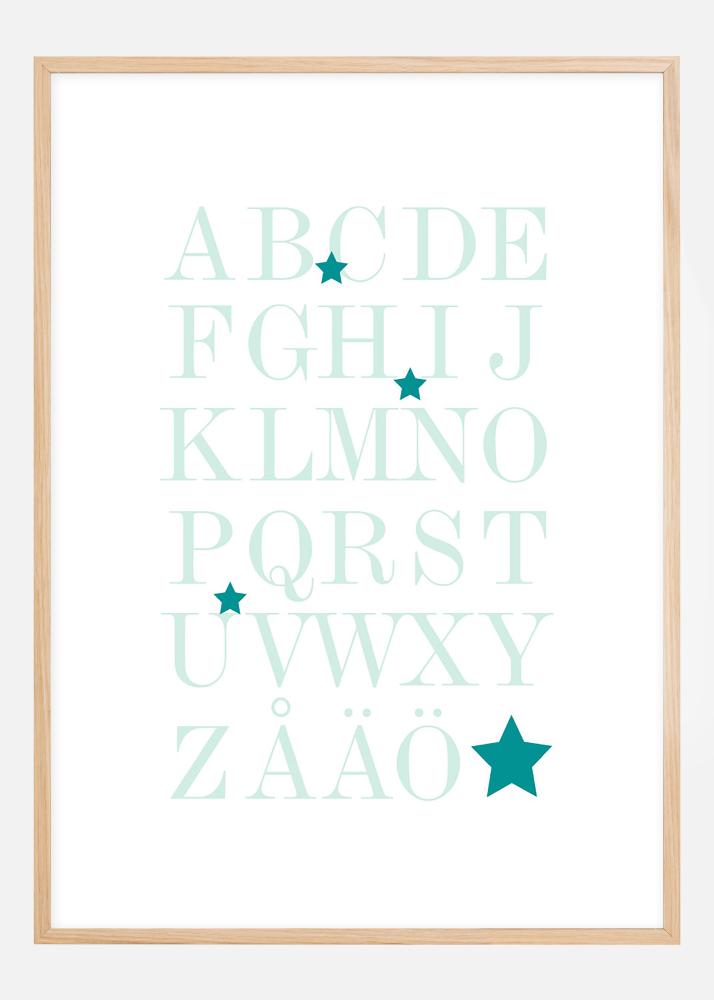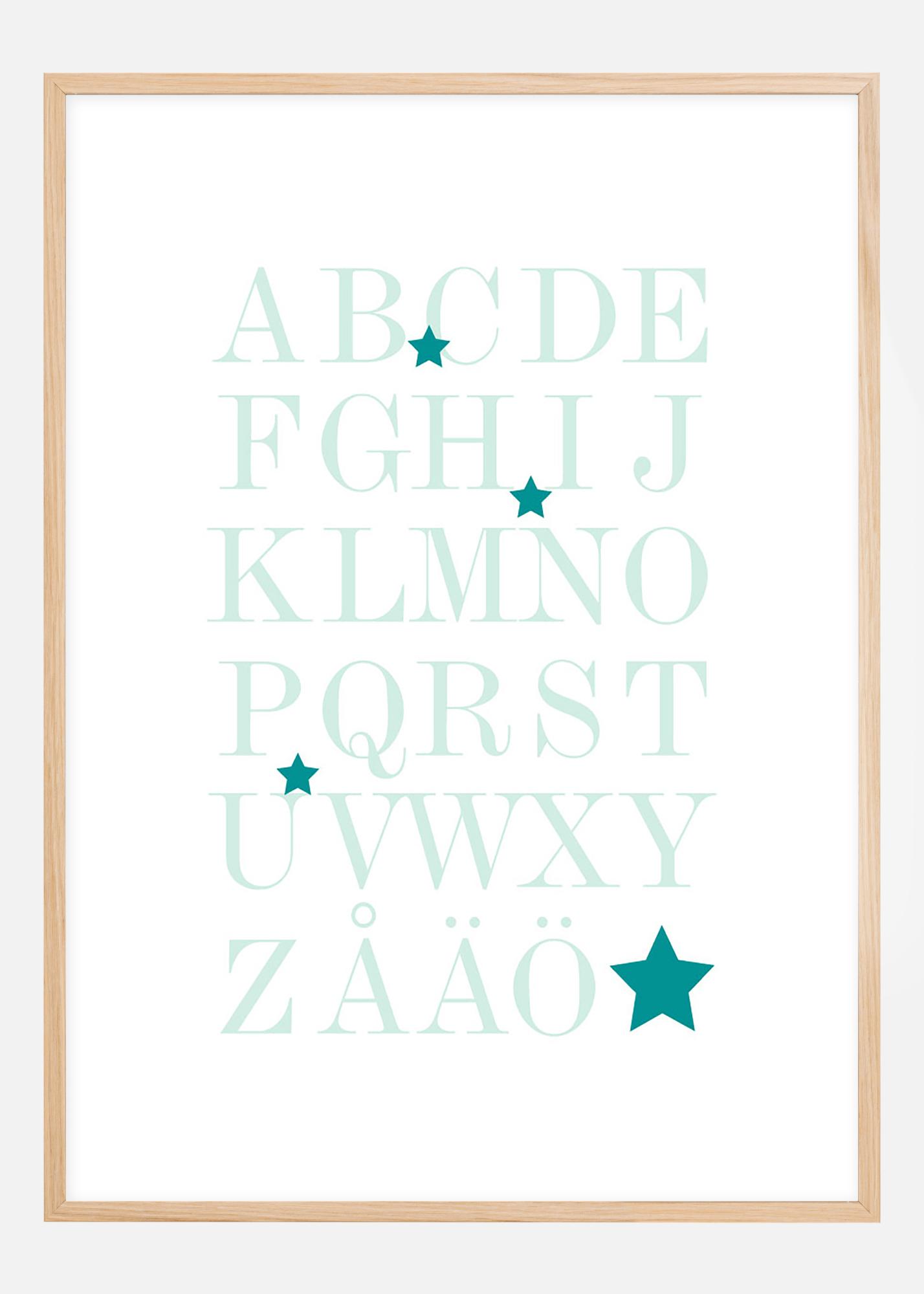Grafická tlač s celou abecedou, A-Ö, v zeleno-tyrkysových odtieňoch mora. Pedagogický motív je vhodný do detskej izby na precvičovanie abecedy, ale aj na iných stenách v dome. Elegantný výraz zabezpečuje, že plagát sa hodí do všetkých štýlov interiéru a typov domov. Skombinujte ho s inými obrazmi na stenu s témou alebo ozdobte stenu spolu s plagátom s číslami 1-10.