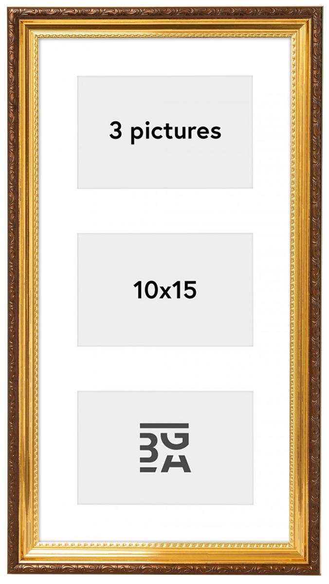 S touto kolážovou rámčekou môžete ozdobiť svoju stenu obrázkami rodiny, priateľov a fotospomienok z nádherných chvíľ života. Rám má miesto pre 3 obrázky vo veľkosti 10x15 cm. Zlatý rám má krásny retro štýl s dekoratívnou vonkajšou lištou v teplom hnedom odtieni. Nástenný držiak je súčasťou.