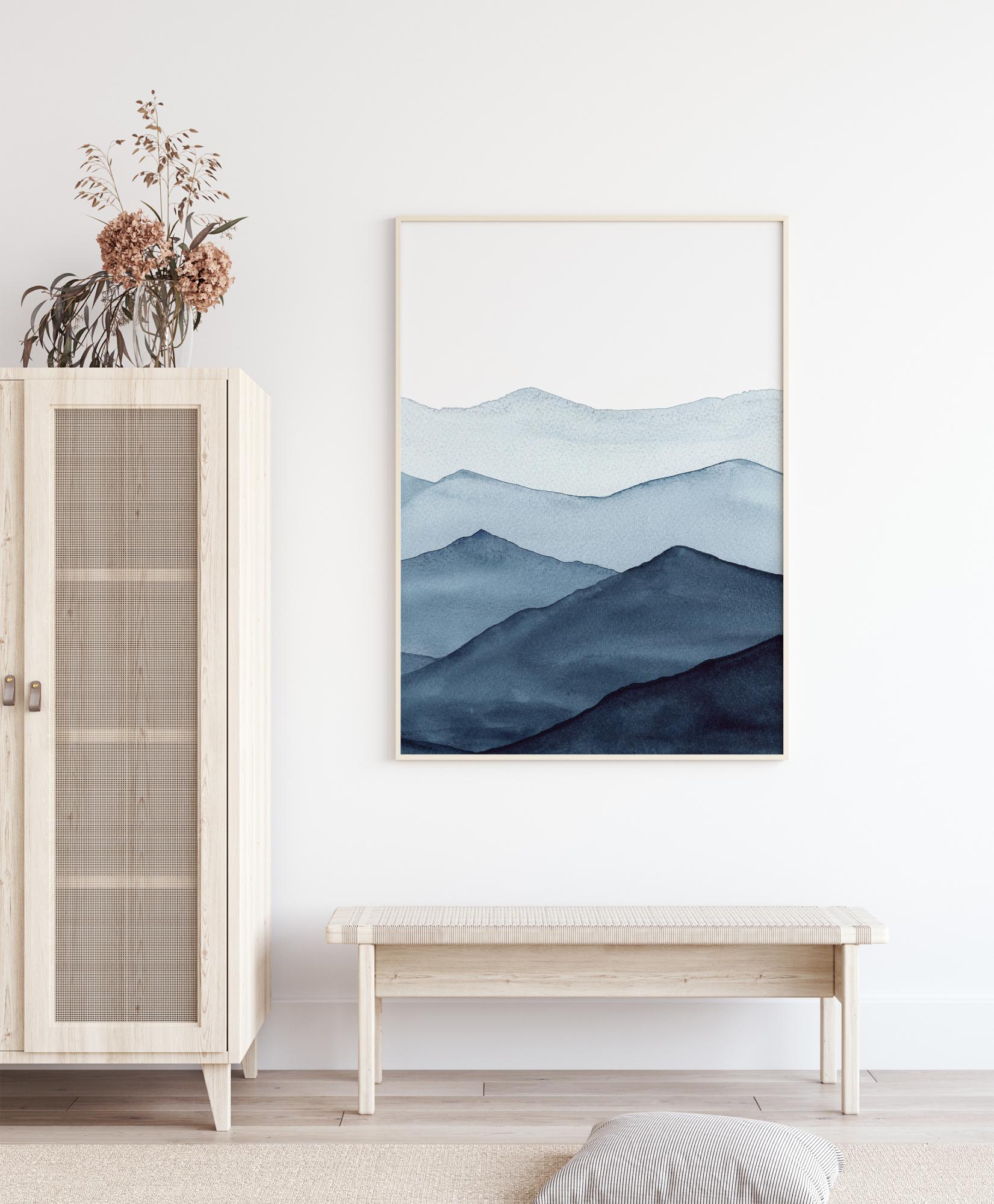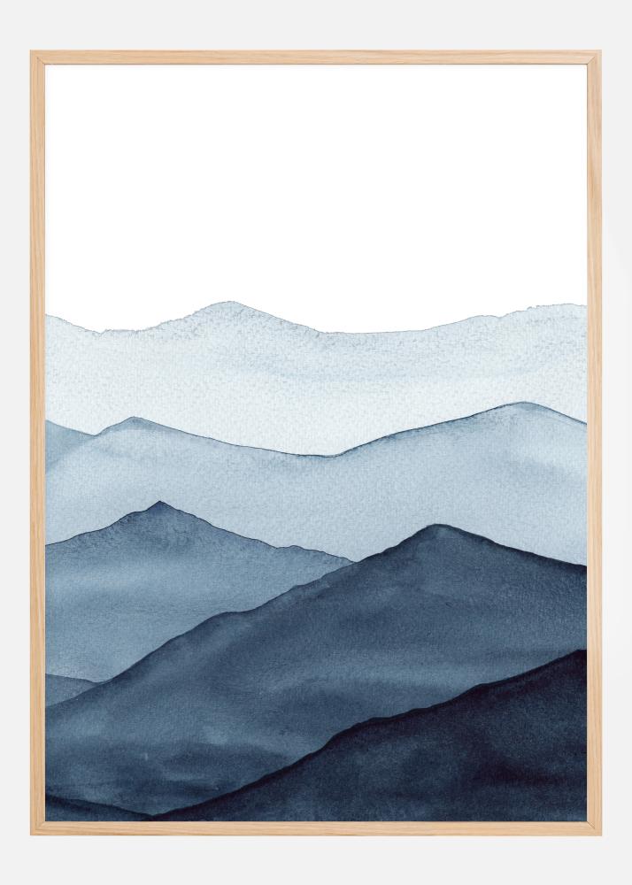 Fantastický minimalistický plagát s radom modrých hôr. Najbližší vrchol hory má tmavý odtieň modrej, pričom farby sú čoraz vyblednutejšie, keď sa hory strácajú v diaľke. Jemné modré farby sú perfektné na vytvorenie chladného, ale upokojujúceho prostredia, keď sa dívaš do diaľky.