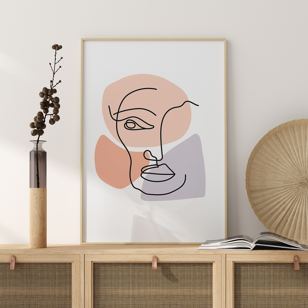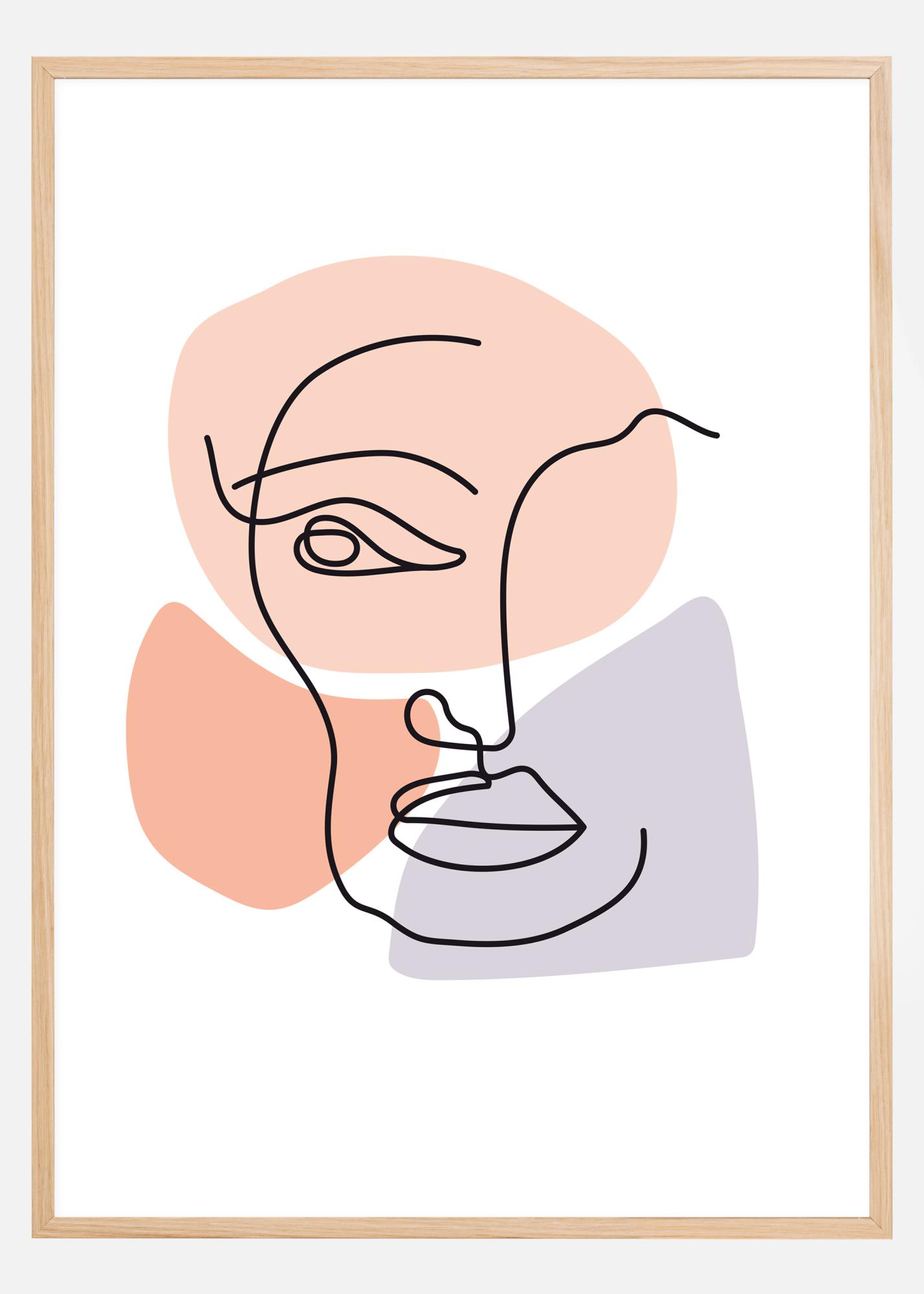 Abstraktný plagát s kontemplatívnou tvárou, ktorá vzbudzuje zvedavosť. Tenké čierne čmáranice vytvárajú nos, oči, ústa a bradu tejto bdelej tváre. Jemné modré, ružové a broskyňové tvary sú pod ňou, aby jej dodali tvar. Kombinujte to s výrazne farebnou stenou, aby ste vytvorili skutočné vyhlásenie, ktoré prebúdza predstavivosť.