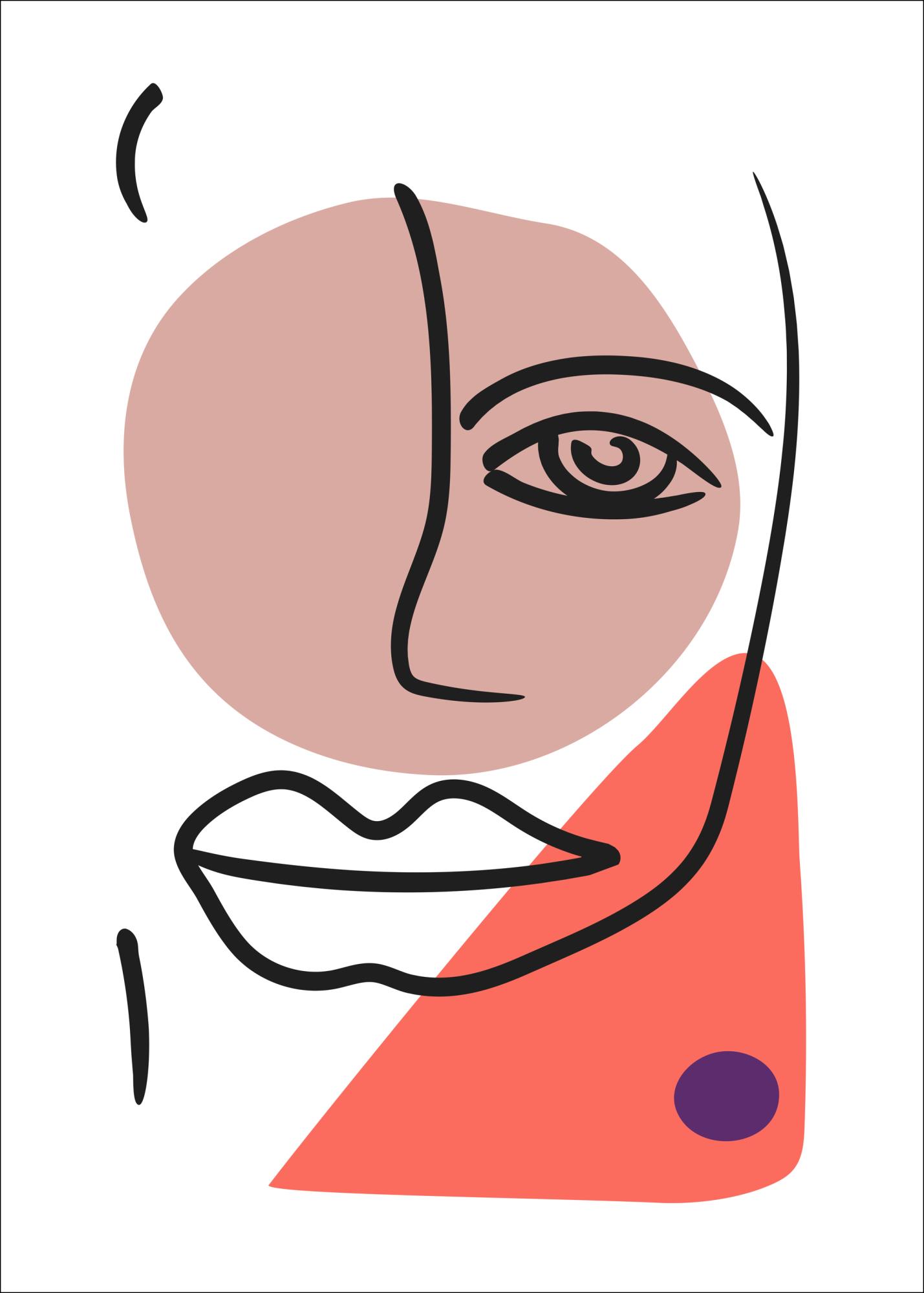 Abstraktný plagát tváre s očami, nosom a plnými perami. Čierne línie tváre sú umiestnené na ružovom kruhu a broskyňovom trojuholníku, čo vytvára dramatický efekt. Zachyťte pocit a nechajte sa inšpirovať každý deň pomocou tohto jedinečného plagátu, ktorý prebúdza fantáziu k životu.