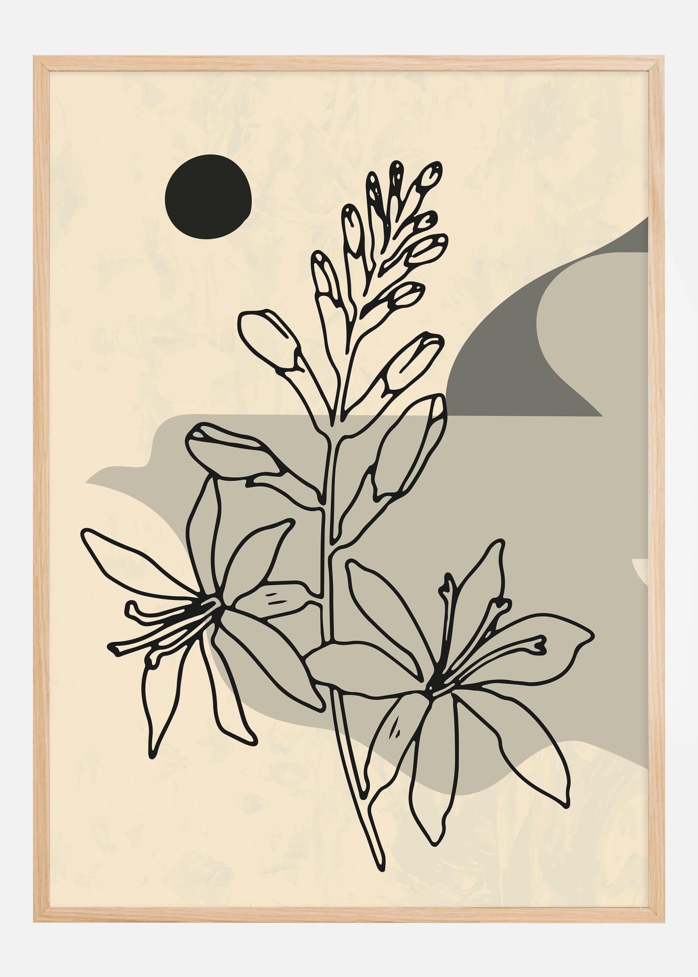 Tento esteticky príťažlivý plagát zachytáva abstraktnú interpretáciu kvitnúcich kvetov, kde sa grafické línie stretávajú s organickými tvarmi. Dielo je umiestnené na neutrálne béžovom pozadí, doplnené tmavým, kruhovým tvarom, ktorý pridáva kontrast a hĺbku. V popredí sa nachádzajú štýlizované kvety a púčiky, ktoré sa črtajú dohora v siluete, vytvorené ostrými čiernymi obrysmi, ktoré poskytujú silný vizuálny efekt.