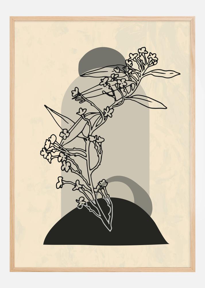 Tento sofistikovaný plagát zobrazuje abstraktné kvetenstvo, ktoré kombinuje prírodné tvary s grafickými prvkami pre súčasný pocit. Motív využíva jemnú farebnú škálu s mäkkými béžovými tónmi a odvážnymi čiernymi líniami, čo poskytuje kontrast, ktorý je zároveň výrazný aj elegantný. Dizajn kladie veľký dôraz na kompozíciu a rovnováhu, pričom umiestňuje organické tvary kvetov a listov nad pevným čiernym polkruhom, ktorý vytvára ilúziu tieňa a hĺbky.