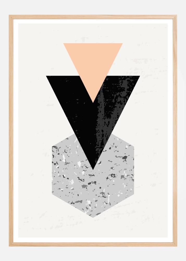 Geometrický plagát s trojuholníkovým tvarom a svetlými, odvážnymi formami. Dva trojuholníky v ružovej a čiernej farbe smerujú nadol, čo vedie oko k jemnejšej modrej a čiarkovanej kocke. Centrálne umiestnený čierny trojuholník udržuje pozornosť, čo robí z tohto plagátu dokonalú prezentáciu do domácej kancelárie, s jej menej rušivým dizajnom, ktorý je kompatibilný s akoukoľvek miestnosťou.