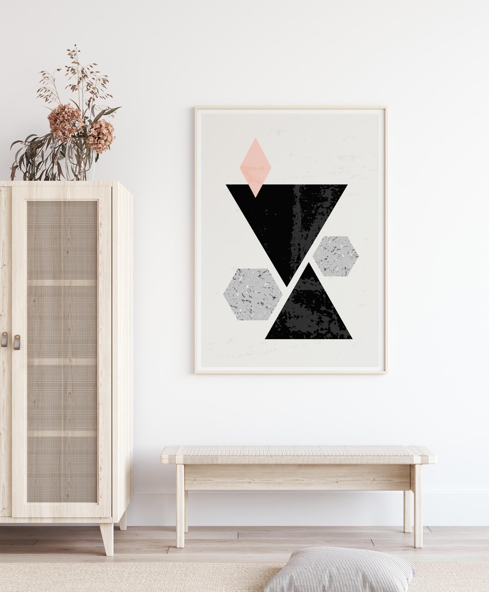 Silný geometrický plagát plný abstraktných tvarov, ktoré všetky zapadajú do súvislého dizajnu. Dva veľké čierne trojuholníky stoja spolu a vytvárajú presýpacie hodiny. Okolo nich je ružový diamant a dva modré skalnaté šesťhranné tvary, ktoré všetky dobre zapadajú do tohto silného a zaujímavého obrazu. Zaveste tento obraz do haly, aby ste urobili silné vyhlásenie.