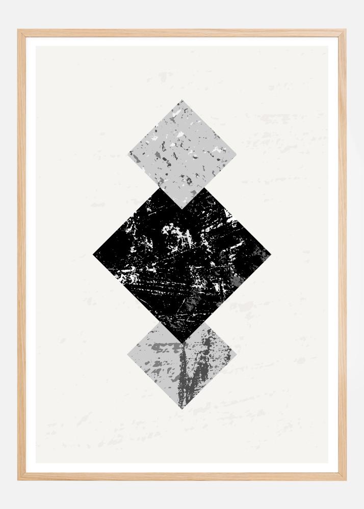 Geometrický plagát s tromi štvorcami umiestnenými v strede bieleho pozadia. Veľký štvorec v strede je čierny s mramorovými efektmi. Po oboch stranách sú dva menšie modré štvorce s mramorovými a štrkovými efektmi. Oko je priťahované cez dielo pomocou bodov v každom štvorci na tomto takmer symetrickom diele.