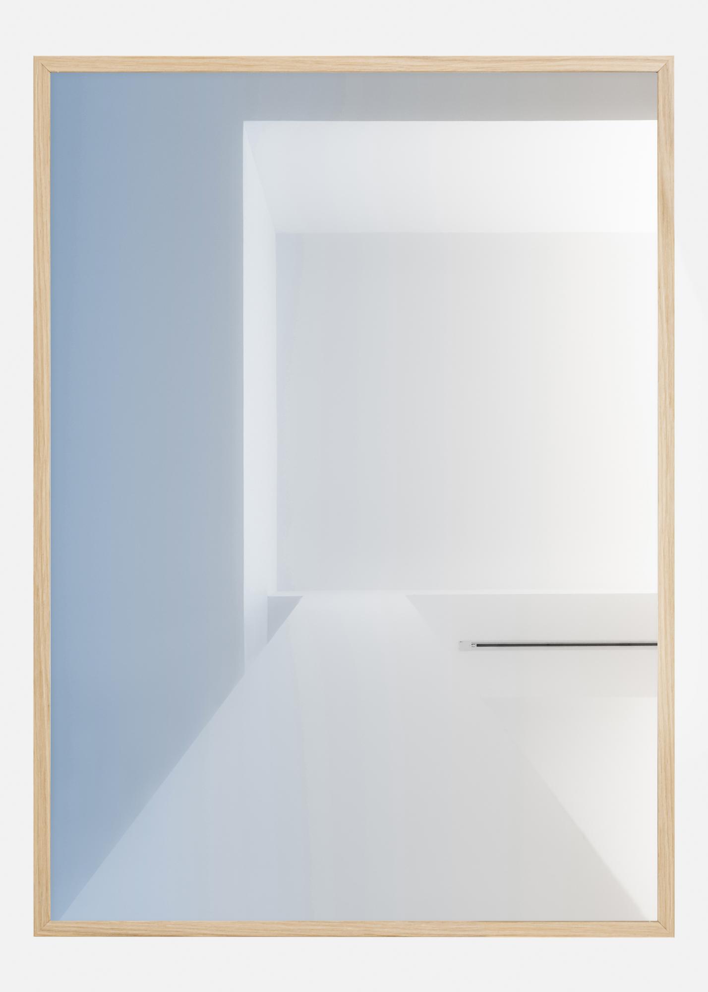 Abstraktný plagát na interiérové použitie s upokojujúcou modrou a bielou. Hlavné pozadie je jemne modré s bielym štvorcom, ktorý vyzerá ako okno a pracovná doska. Výbuch jemne žiariacej bielej na pravej strane pôsobí, akoby slnko prerazilo pre nádych pokoja vo vašom domove.
