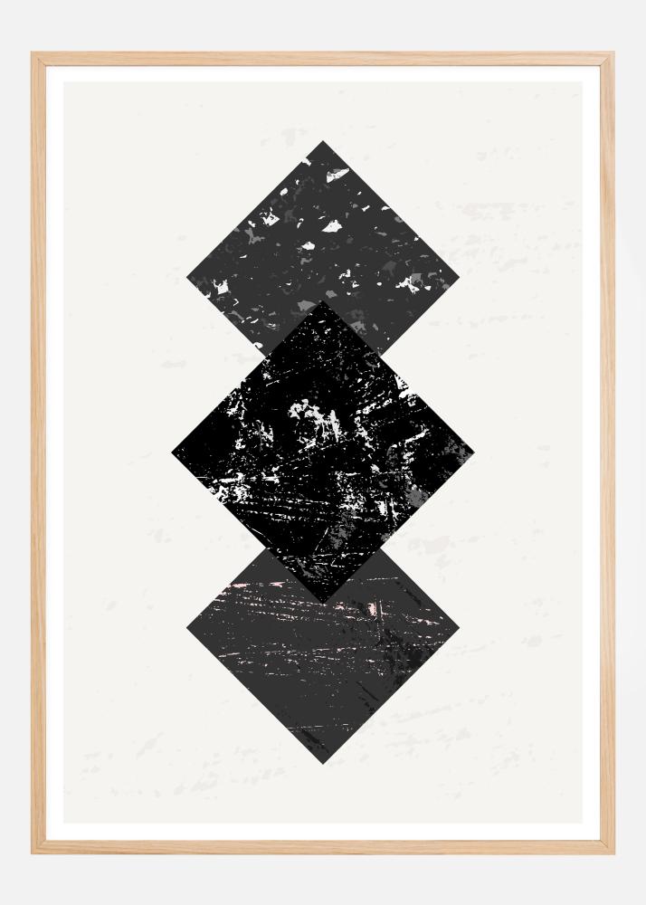 Geometrický plagát s tromi tmavými štvorcami, ktoré sú postavené na svojich hrotoch. Dva námornícke modré štvorce sú umiestnené nad a pod väčším čiernym štvorcom. Všetky sú zvýraznené bielymi bodkami a škvrnami, ktoré vytvárajú zaujímavú súpravu vzorov. Skombinujte toto umelecké dielo s modrou stenou a nechajte tvary vyniknúť.