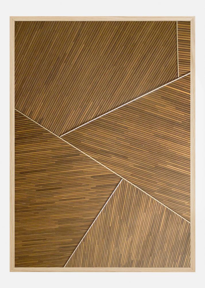 Plagát s dreveným vzorom s abstraktnými geometrickými tvarmi. Predstavte si, že drevené dosky do seba zapadajú v tomto jednoduchom vzore. Uhly dosiek vedú pohľad okolo diela a biele línie tvoria bezchybné ohniskové body. Urobte z toho niečo, čo vynikne na jednoduchej neutrálnej alebo bielej stene vo vašom dome.