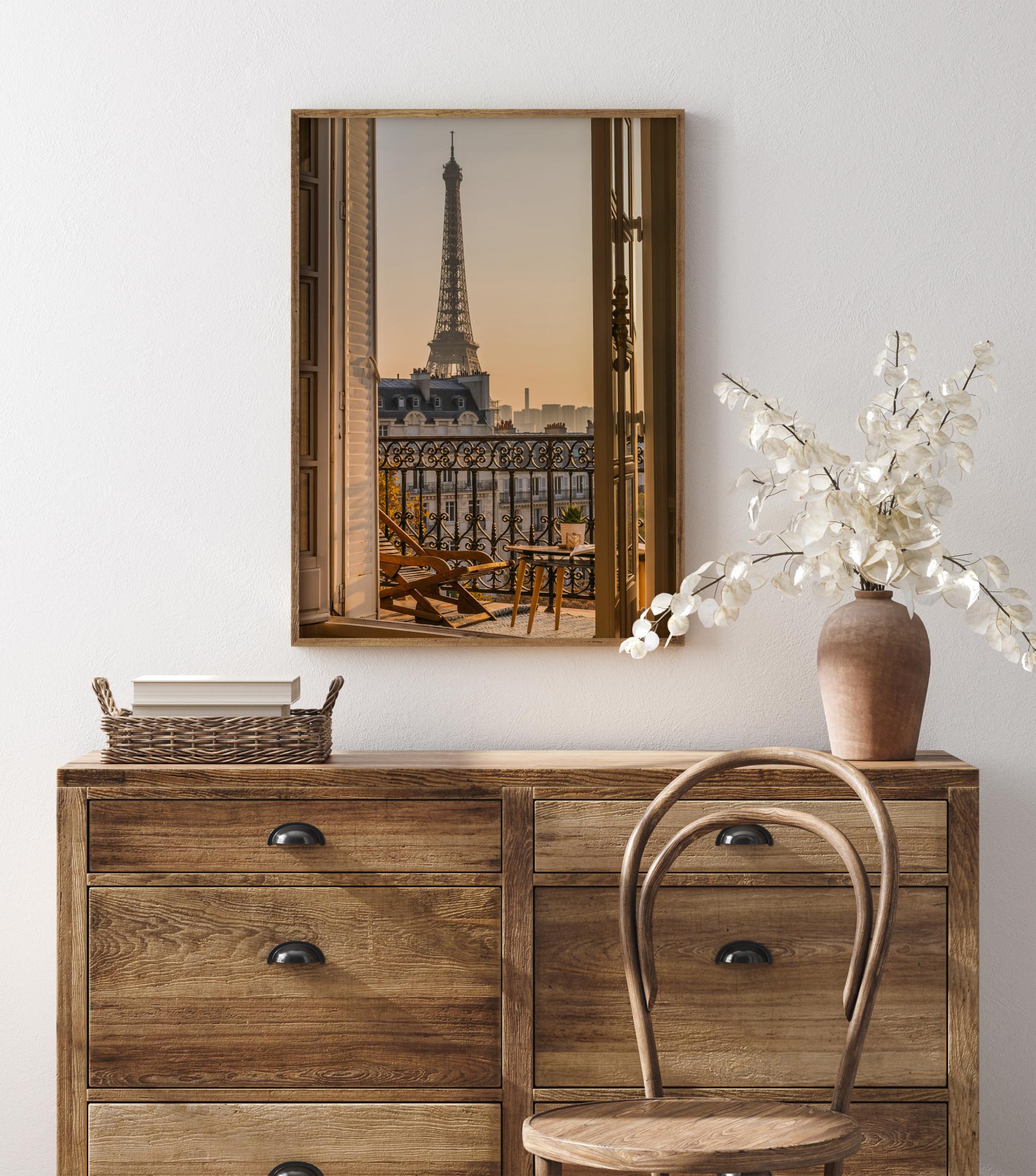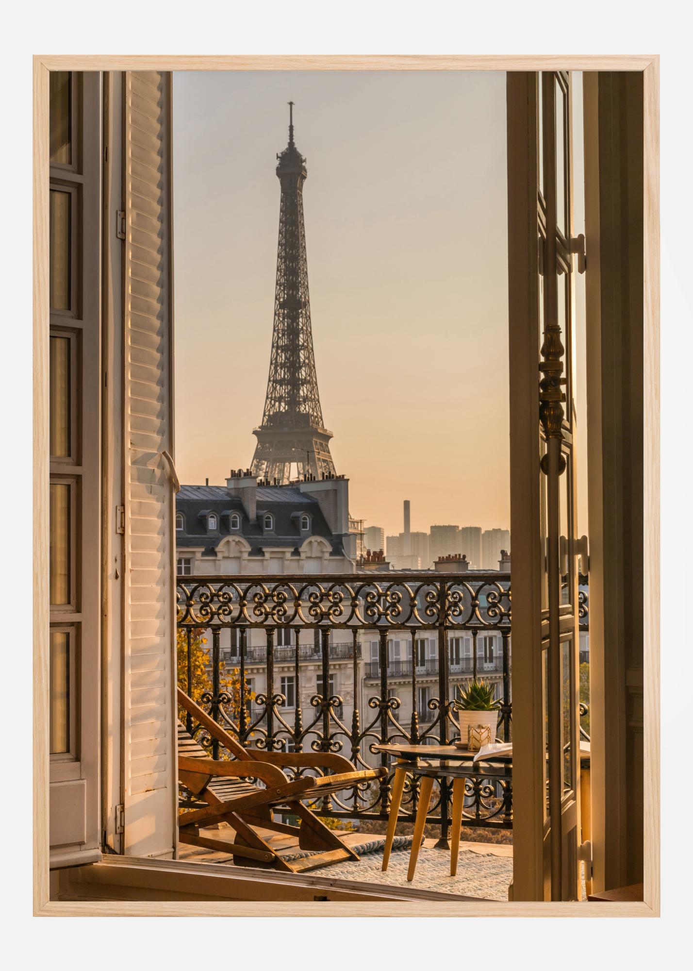 Krásny plagát mestského panorámu, ktorý zobrazuje Eiffelovu vežu v diaľke. Ozdobený balkón je miestom tejto fotografie s jemným ranným svetlom, ktoré pokrýva stoličku a zábradlie. Veža stojí vysoko a priťahuje pohľad. Takmer môžete cítiť chladný vánok cez otvorené dvere.