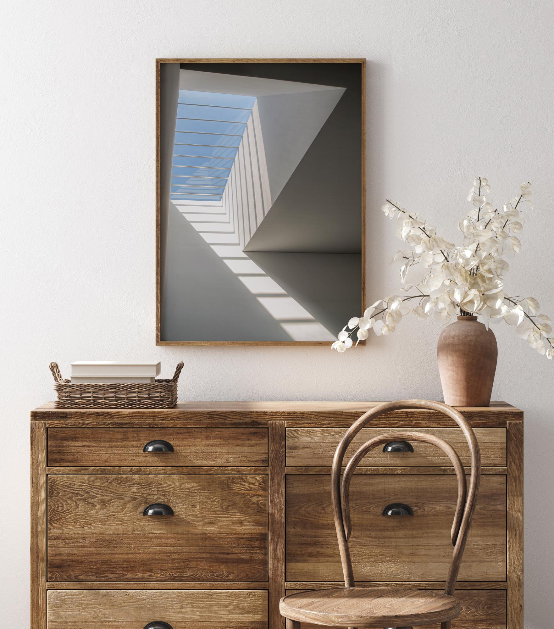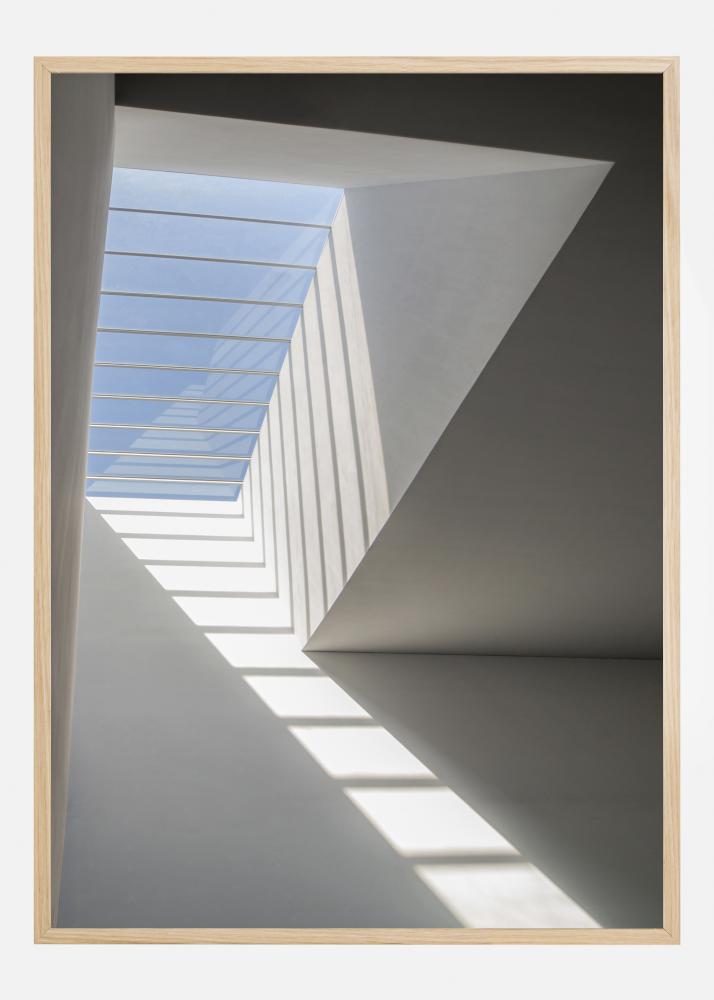 Jednoduchý a vzdušný plagát v svetlej bielej miestnosti. Vľavo je strešné okno s modrou oblohou. Svetlo, ktoré prúdi, vrhá tiene, ktoré vyzerajú ako rebrík vedúci oko smerom nahor k vonkajšiemu svetlu. Privolajte jas do tmavej miestnosti pomocou tohto pokojného obrazu.