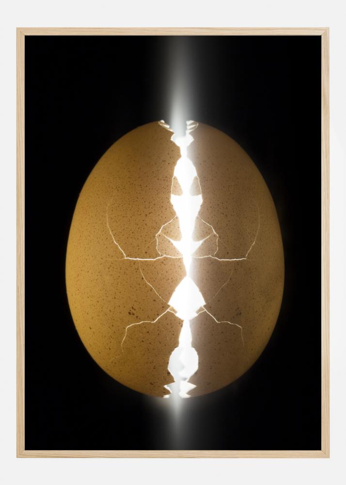 Dramatický abstraktný plagát s vyliahnutím vajca, so silným svetlom, ktoré z neho vyžaruje, všetko na čiernom pozadí. Svetlo preniká v úžasnom symetrickom vzore. Lúče svetla prekonávajú tmu v abstraktnom, ale presvedčivom obraze, ktorý je dokonalý na ktorejkoľvek z tvojich stien.