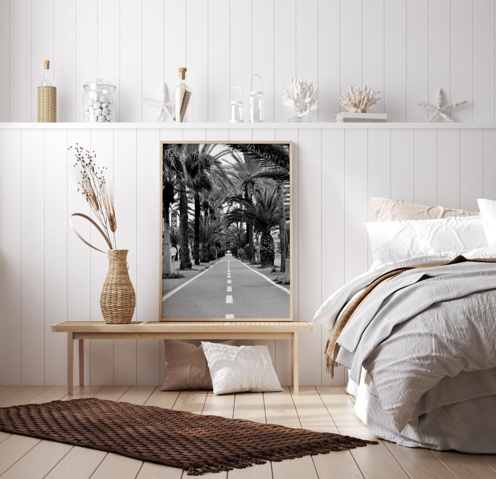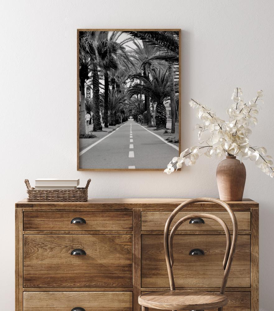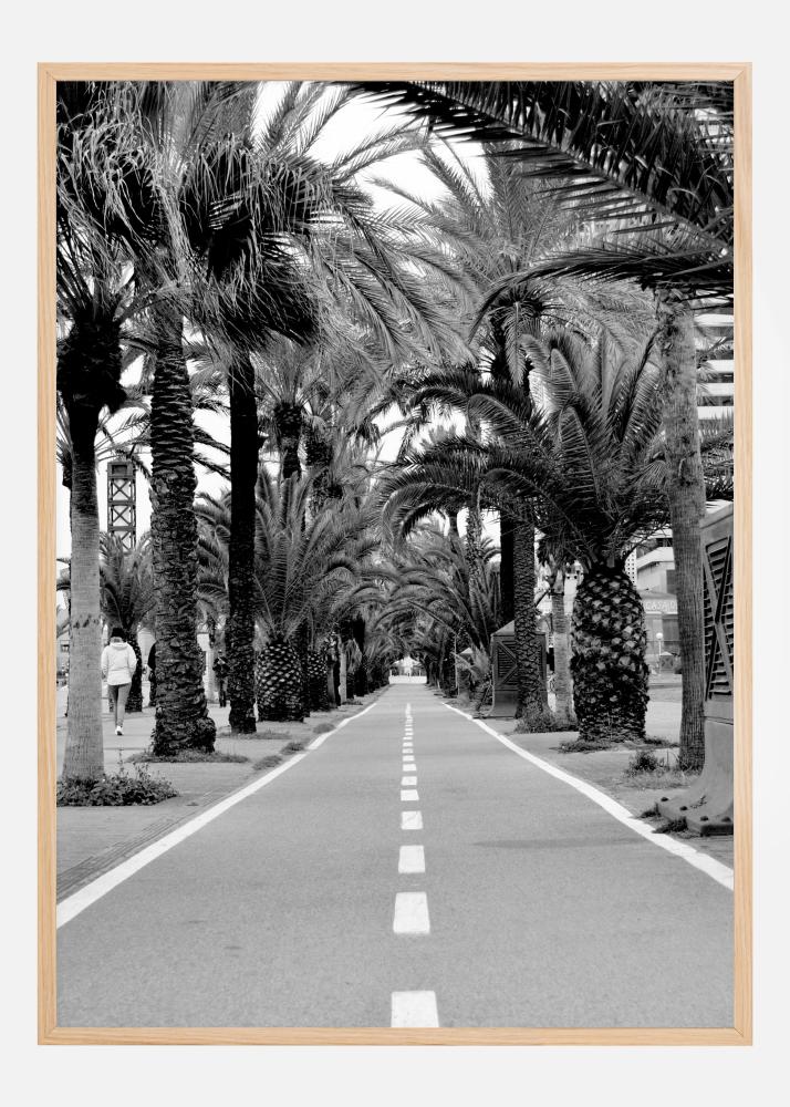 Krajinný poster cesty vedúcej cez háj s palmami. Palmy tvoria hranicu cesty, zatiaľ čo biele čiary vedú do diaľky. Stromy vytvárajú oblúk, ktorý vedie pohľad novým smerom. Umiestnite túto čiernobielu krásu na stenu pre exotický pocit.