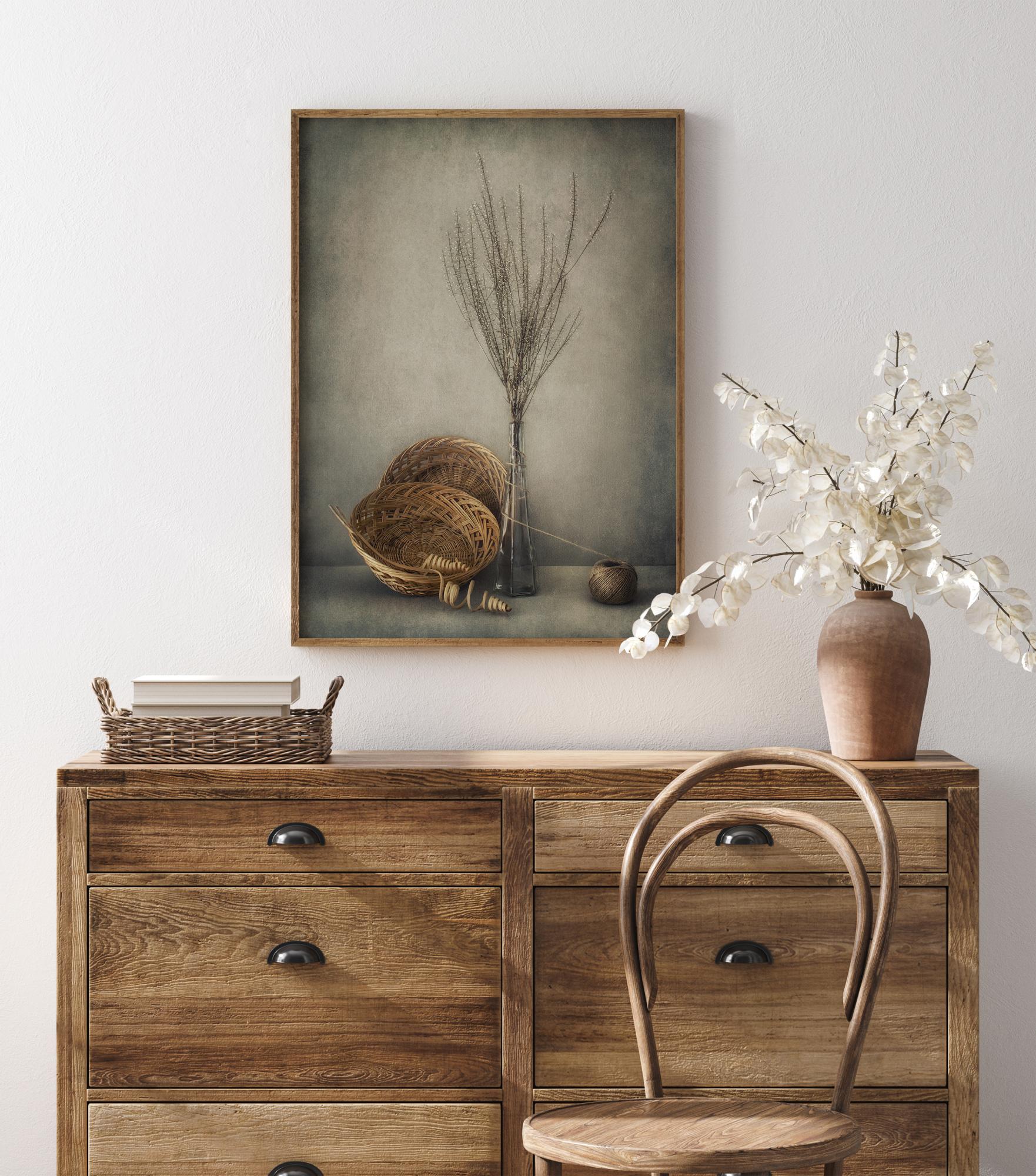 Zátišie s košmi, hlineným hrncom a sklenenou fľašou so sušenou trávou. Toto dielo má jemné sépiové a sivé tóny, ktoré vytvárajú jemné a harmonické dielo. Prineste si do domácnosti trochu pokoja s týmto plagátom a skombinujte ho s neutrálnou stenou, aby neprevládal príliš výrazne.