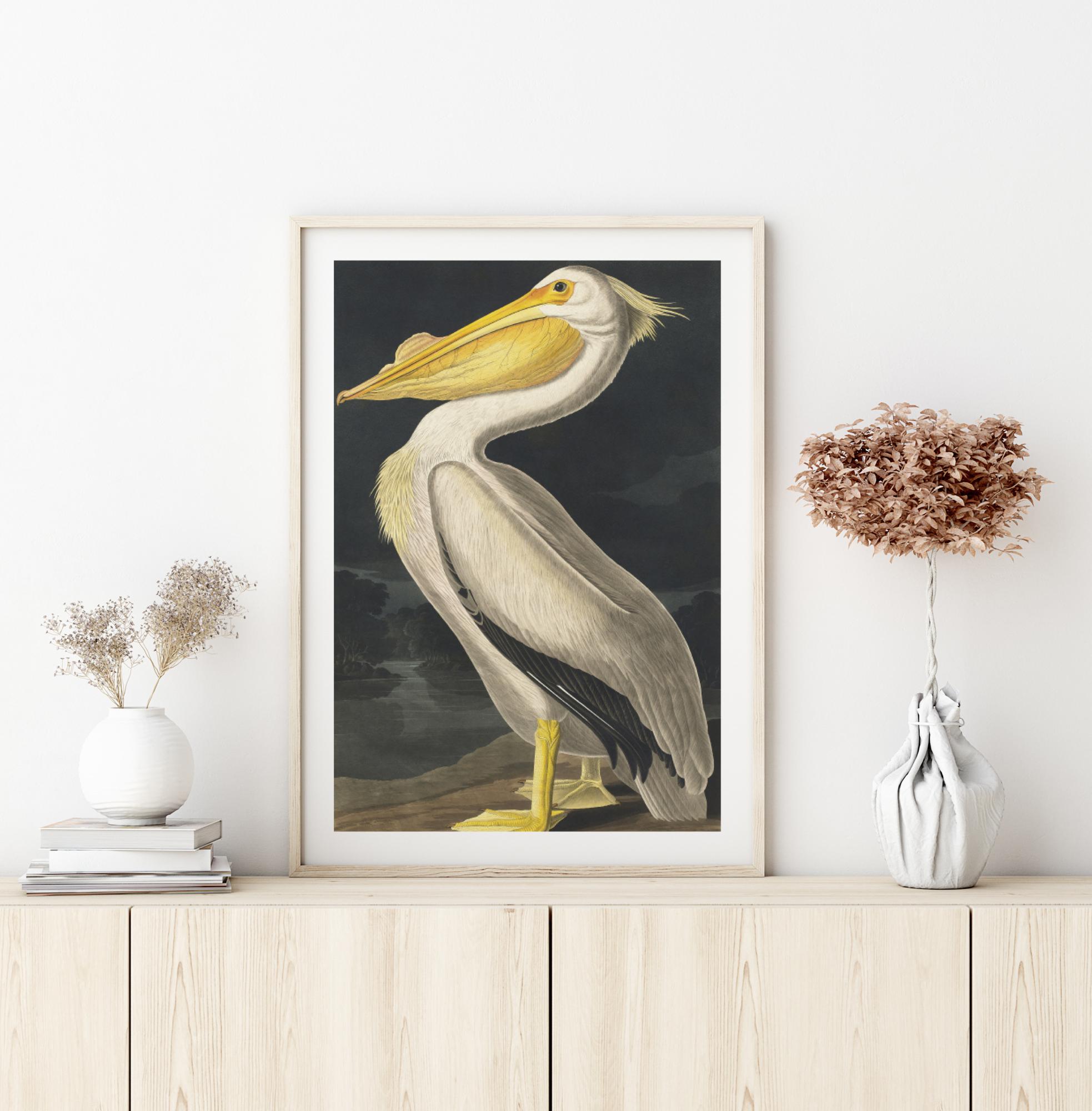 Prírodný plagát s maľovaným pelikánom. Tu sedí vták vysoko a hrdo s robustným žltým zobákom oproti prsiam. Výrazné žlté nohy a biele prsia ostro kontrastujú s tmavou, tlmenou krajinou v pozadí. Prineste si pocit starobylých malieb, keď si kúpite tento úžasný obraz.