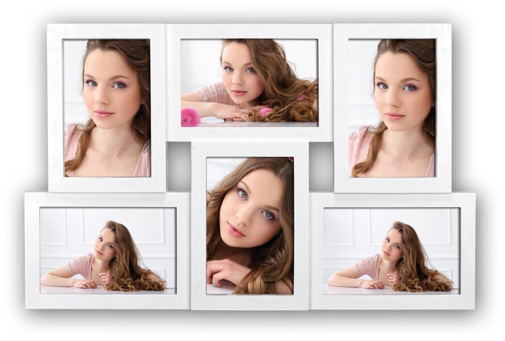 Moderný biely kolážový rám s miestom pre 6 obrázkov v horizontálnom aj vertikálnom formáte. Perfektné, keď chcete vytvoriť osobnú fotokoláž na zavesenie na stenu.