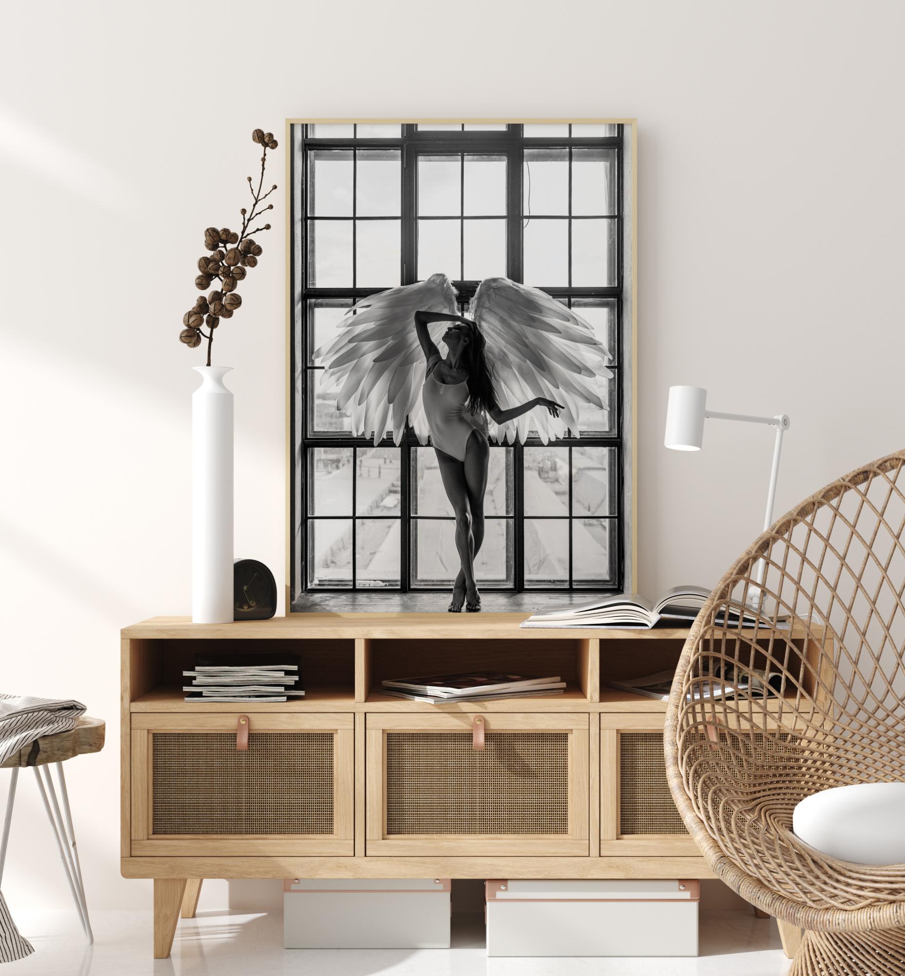 Krásny fotoumelecký plagát v tmavej škále sivej na žene, ktorá pózuje vo veľkom okne oblečená v body a s veľkými krásnymi anjelskými krídlami. Plagát, ktorý sa ľahko kombinuje s inými obľúbenými dielami, ale rovnako dobre sa hodí ako samostatný pútač.
