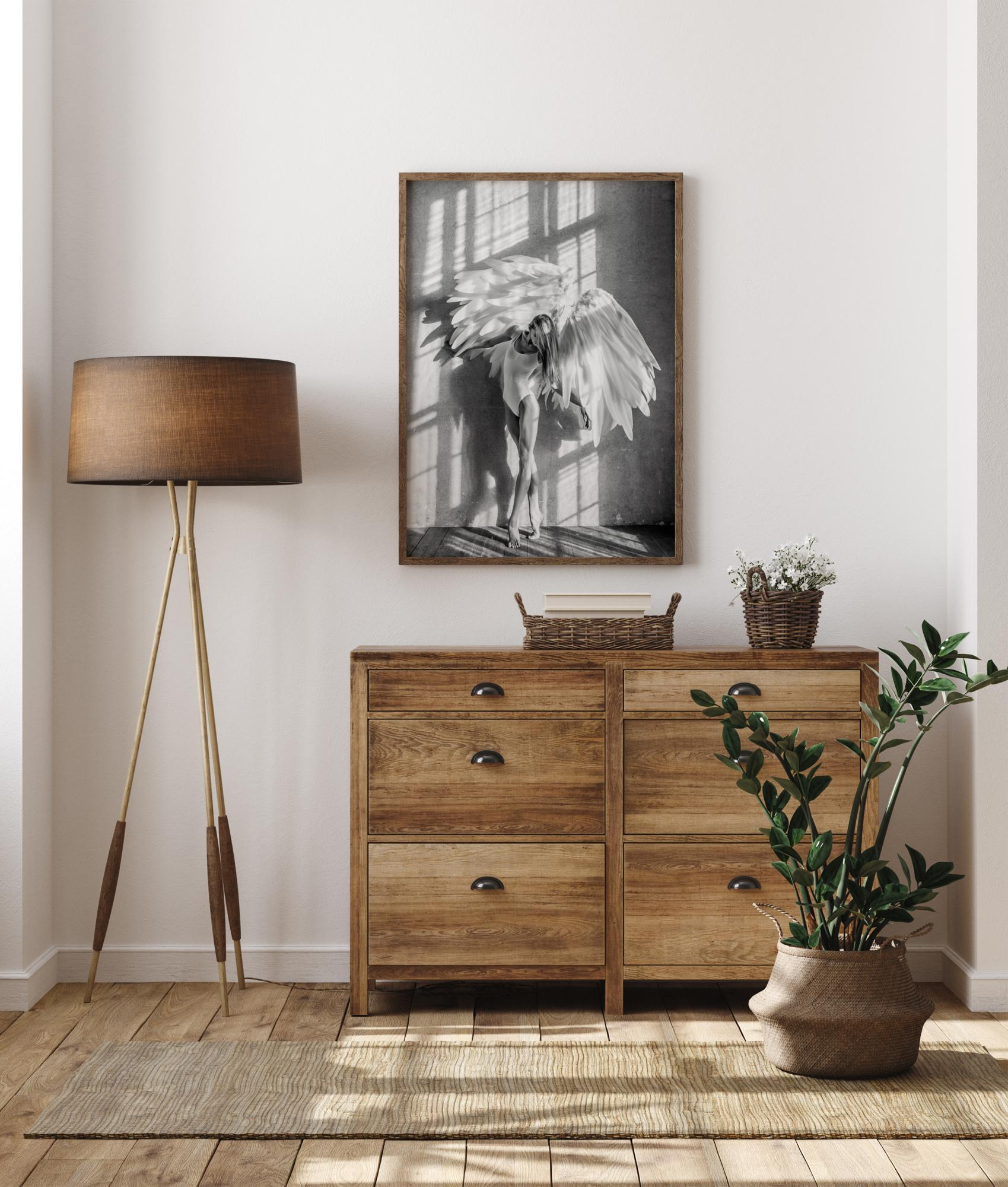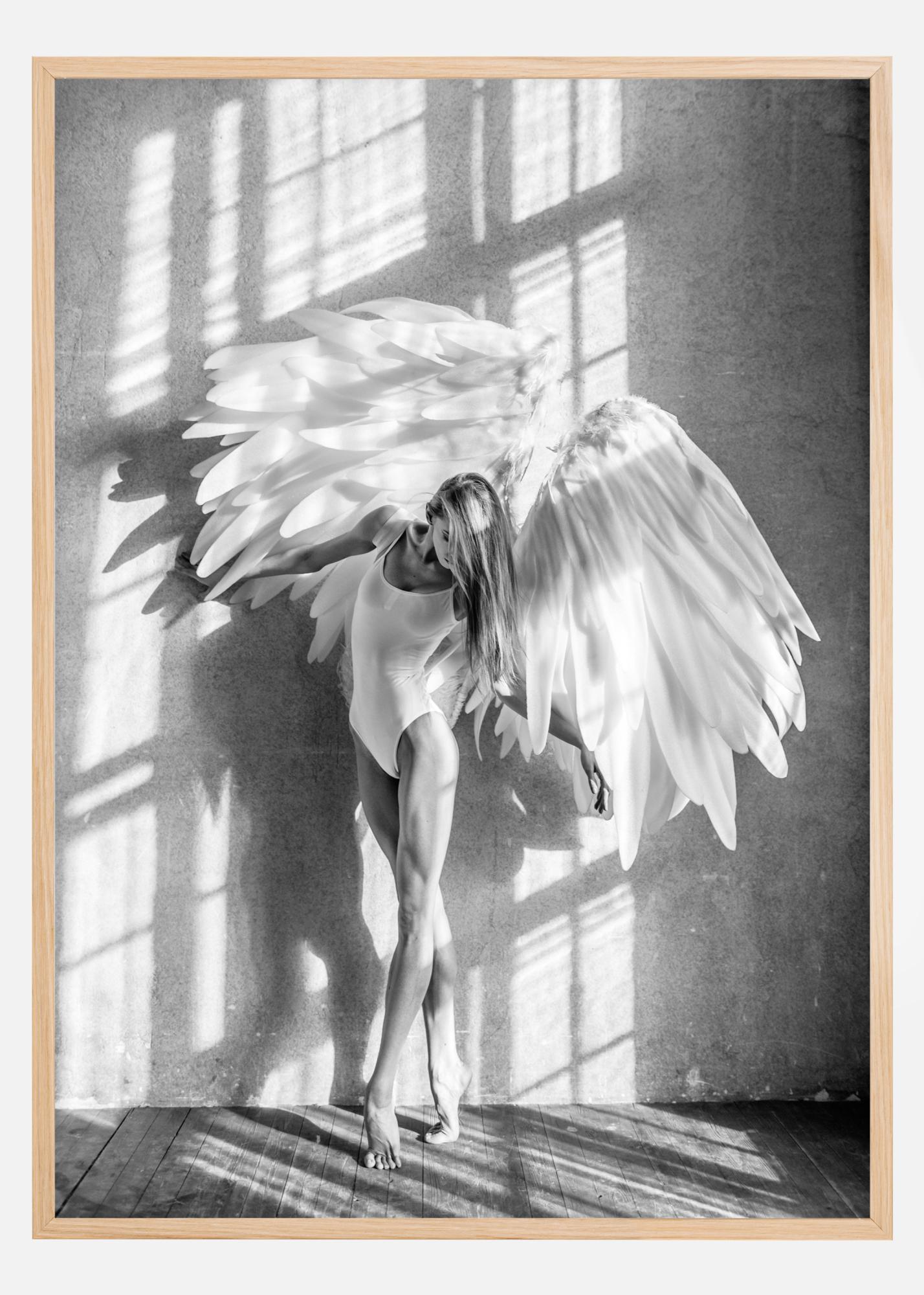 Krásny fotoumelecký plagát v mäkkej šedej škále zobrazujúci ženu, ktorá pózuje ako balerína s veľkými anjelskými krídlami v svetle obrovského okna, ktorého tiene sa hrajú po obraze. Toto je plagát pre tých, ktorí si želajú mäkký a krásny prvok vo svojom dome.