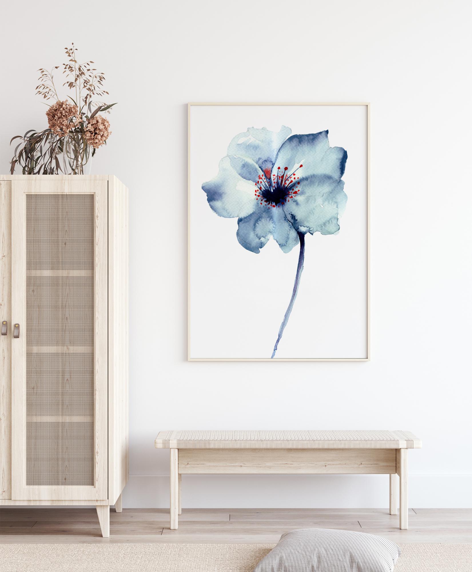 Vznešená kvetina namaľovaná modrou a červenou akvarelou. Krásny plagát vo svojej jednoduchosti, ktorý sa rovnako dobre hodí do kuchyne alebo predsiene ako do obývačky alebo spálne.