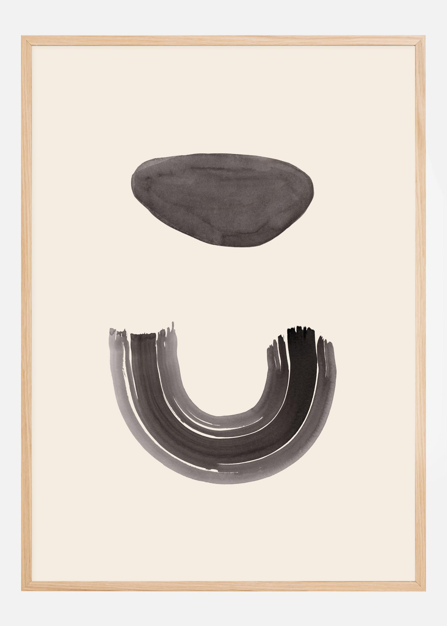 Elegantný abstraktný plagát s oblúkom a kameňom. Kameň je zavesený uprostred bieleho pozadia, obrátený oblúk priamo pod ním pôsobí ako usmiata tvár. Je pod kameňom magnet? Povzbudzujte k voľným interpretáciám, keď si toto dielo zavesíte doma.