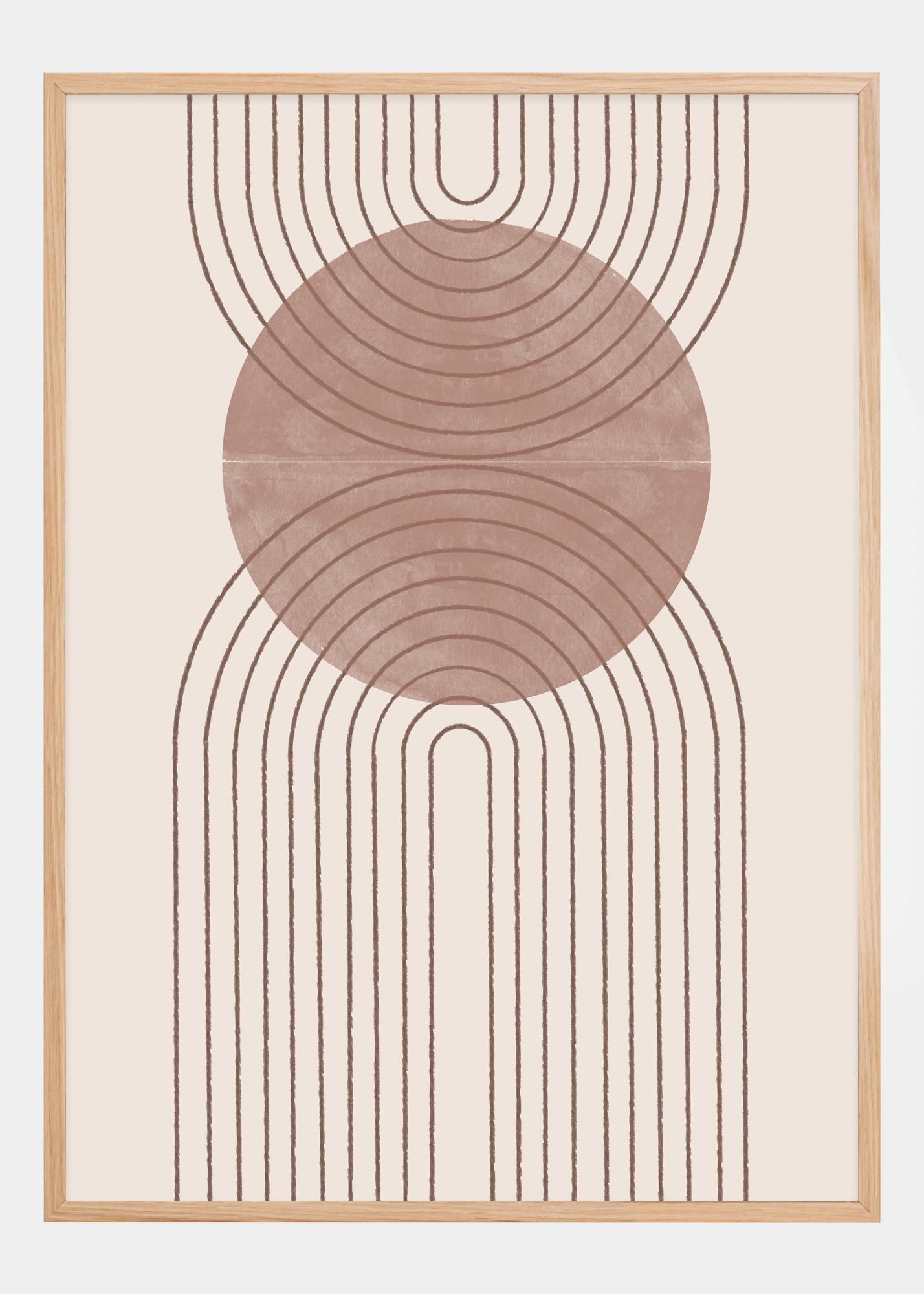 Tento plagát prináša pocit pokoja a organického pohybu so svojimi jemnými, vlniacimi sa líniami, ktoré sa zhromažďujú okolo centrálneho kruhu v teplej, terakotovej odtieni. Utišujúci vzor pripomína pieskovú dunu tvarovanú vetrom alebo pokojné vlny valiace sa na pláž, a ponúka chvíľu reflexie a pokoja.