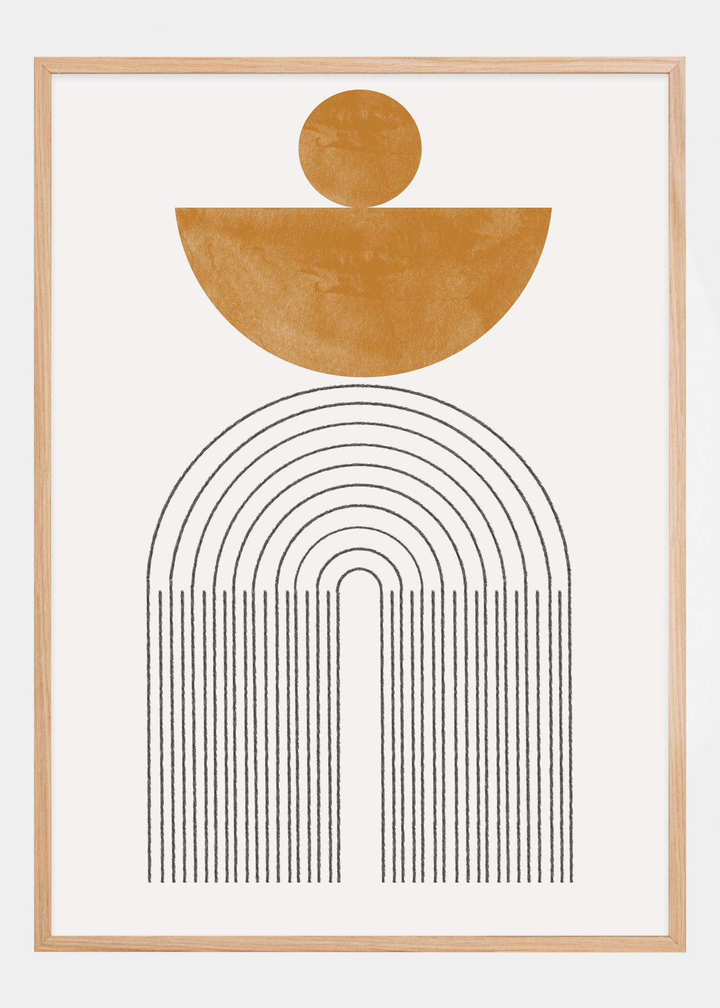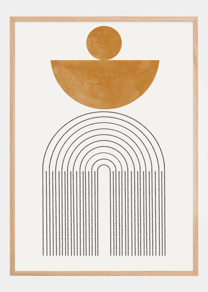 Táto elegantná tlač spája organické tvary a čisté línie v kompozícii, ktorá je upokojujúca a vizuálne zaujímavá. Veľký okrový polkruh sedí ako západ slnka nad sériou oblúkov, čo vytvára architektonický pocit priestoru a hĺbky. Navrchu je dizajn vyvážený menším kruhom, čo pripomína dráhu slnka po oblohe.