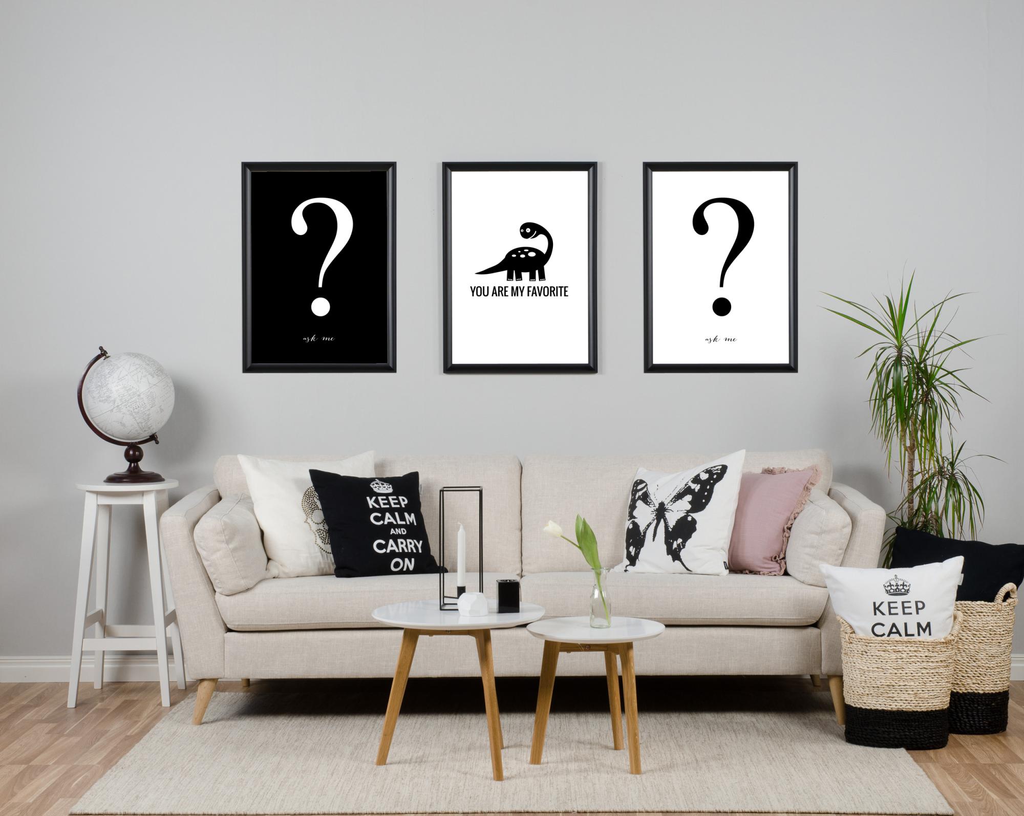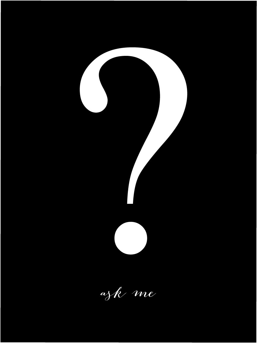 Štýlový grafický list, Opýtaj sa ma, s textom a väčším otáznikom v bielom písme na čiernom pozadí. Pekne sa hodí spolu s inými printmi na nástenke v obývačke alebo nechajte hostí vedieť, že ste otvorená osoba už v chodbe. Plagát je pekný spolu s ostatnými typografickými motívmi v rovnakej sérii - Opýtaj sa ma, Sprav ma alebo Zdieľaj ma.