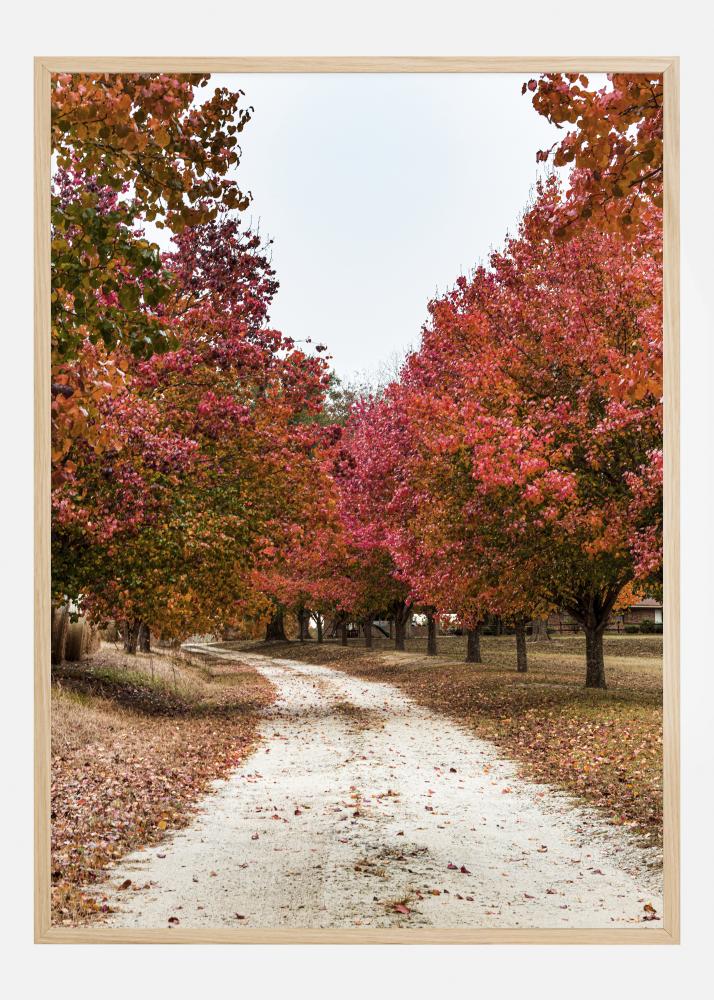 Krajinný plagát jesenného parku a uličky. Biely štrkový chodník prechádza cez živé červenolisté stromy. Svetlomodrá obloha odráža cestu, keď sa točí v diaľke. Znovu prežite krásu jesenných farieb každý deň s týmto plagátom vo vašom dome. Tento plagát môžete zavesiť spolu s akoukoľvek maľbou.