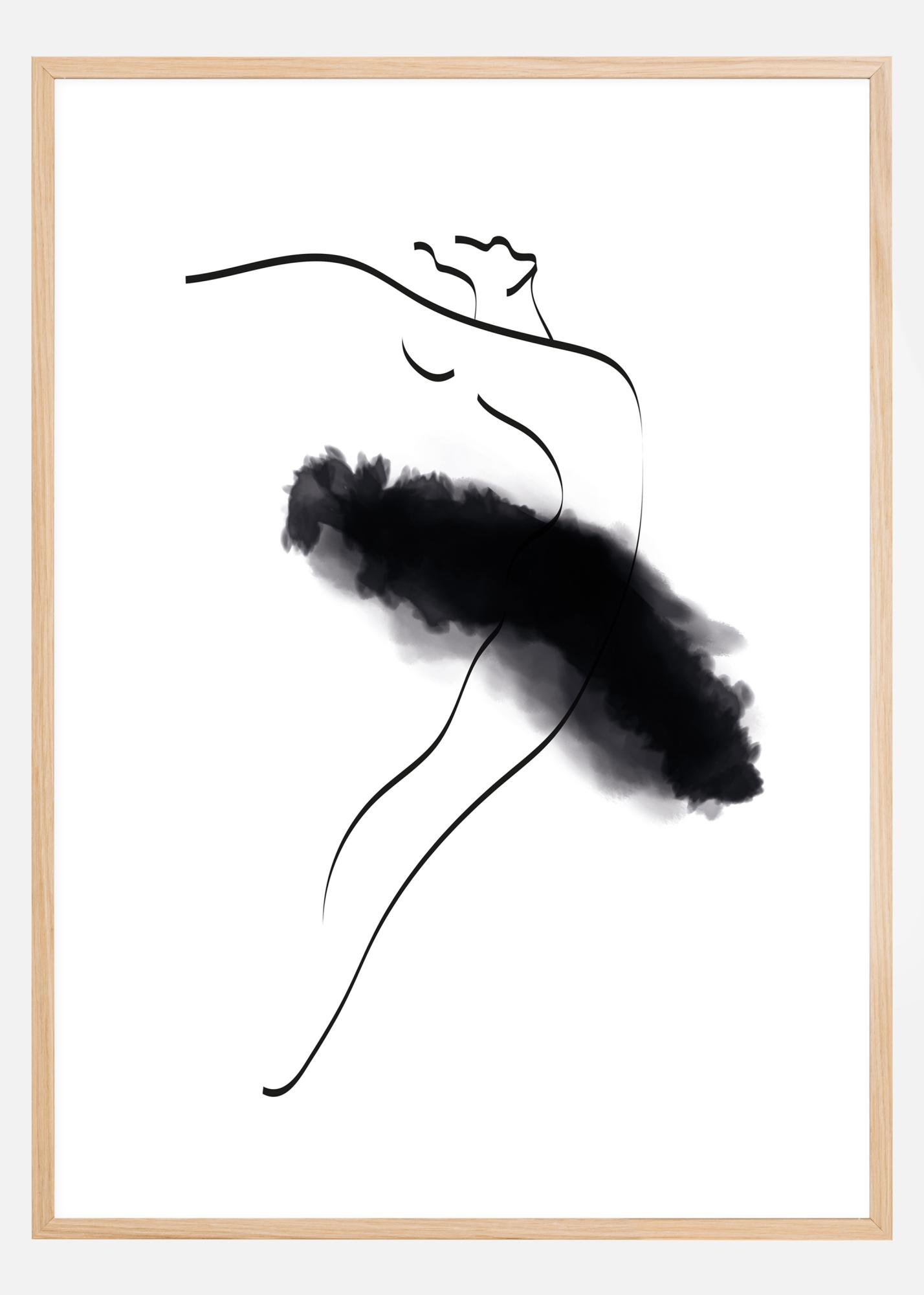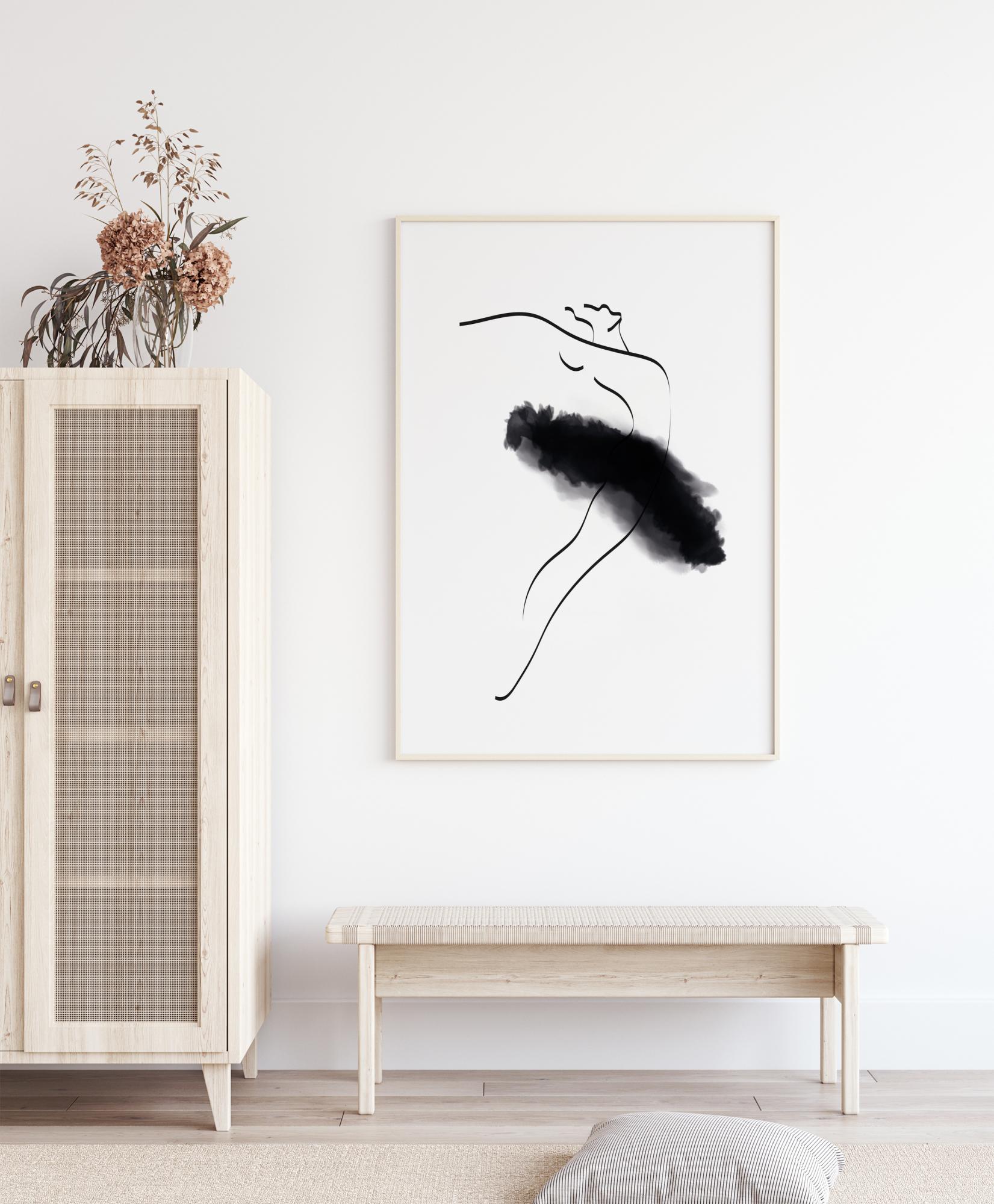 Akvarela baletky v tenkých čiernych líniách s výraznejšou čiernou baletnou sukňou. Minimalistický a elegantný plagát, ktorý sa hodí rovnako dobre do spálne alebo predsiene, ako do obývačky alebo do knižnice.