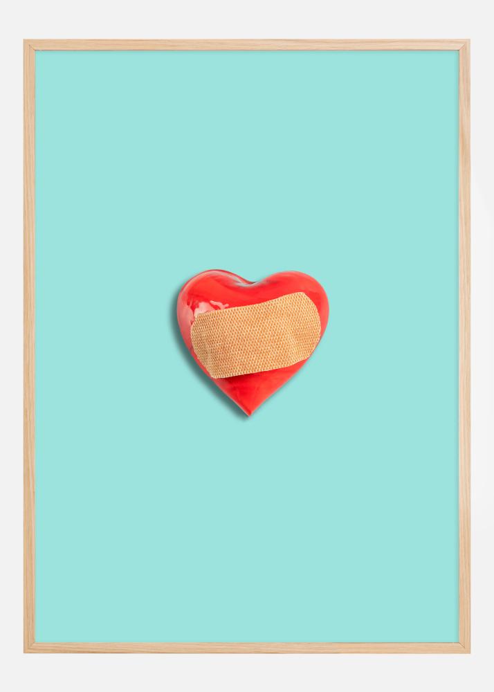 Tento podnetný plagát zobrazuje červené srdce s náplasťou na upokojujúcom tyrkysovom pozadí. Symbolika je silná a otvorená k interpretácii, či už ide o liečenie zlomeného srdca alebo starostlivosť o naše emocionálne rany. Živý kontrast medzi červeným srdcom a upokojujúcim pozadím dodáva obrazu hlbokú a emocionálnu rezonanciu.