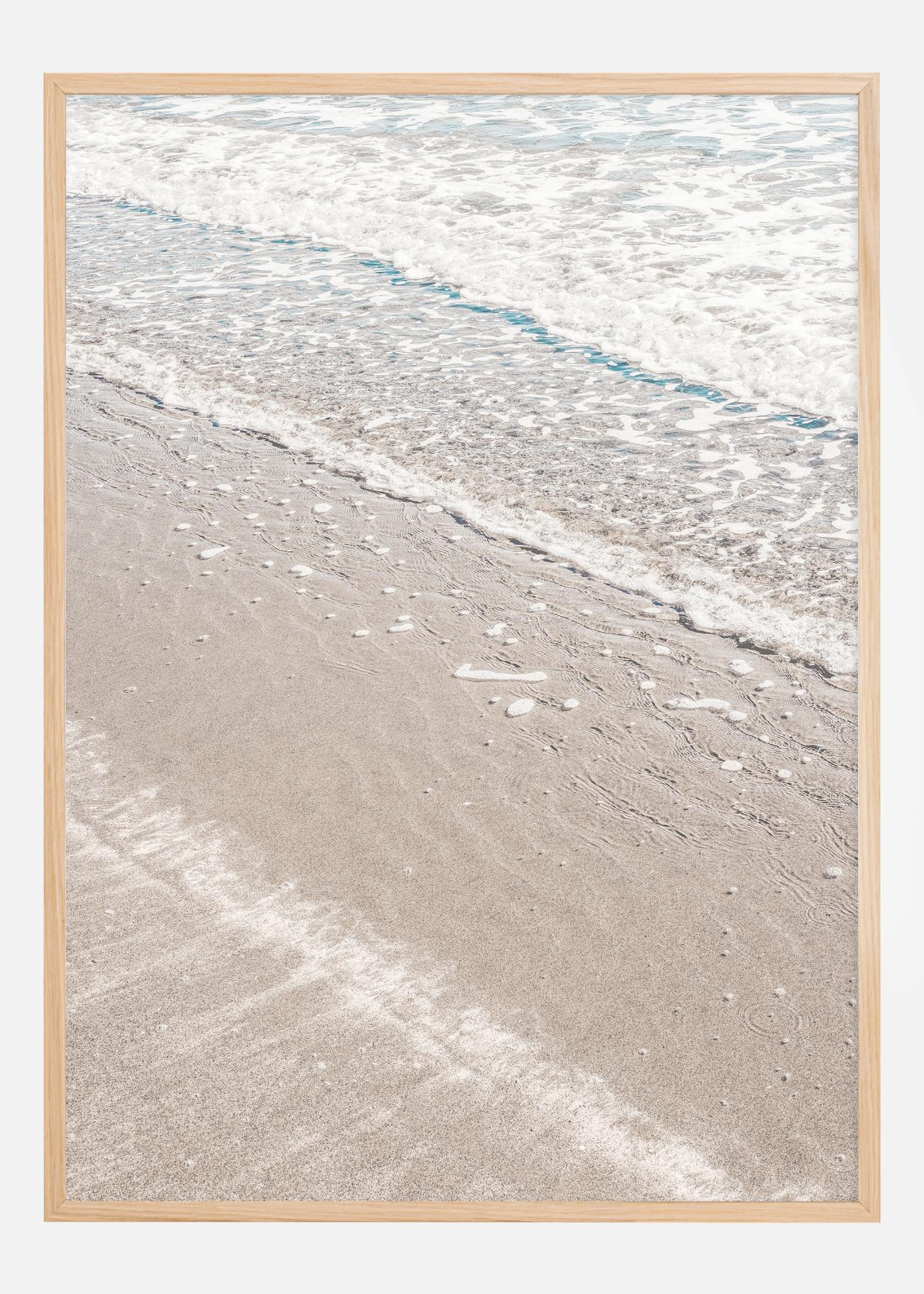 Tento upokojujúci plagát zobrazuje prírodnú krásu hranice pláže, kde sa more stretáva s pevninou. Jemný piesok, formovaný mäkkými vlnami mora, vytvára textúru, ktorá je zároveň jednoduchá a zložitá. Pokojné farby piesku sa harmonicky miešajú s bielou penou mora a jasnou tyrkysovou líniou, kde sa vlna lámu, čo dodáva pocit pokoja a jasnosti.