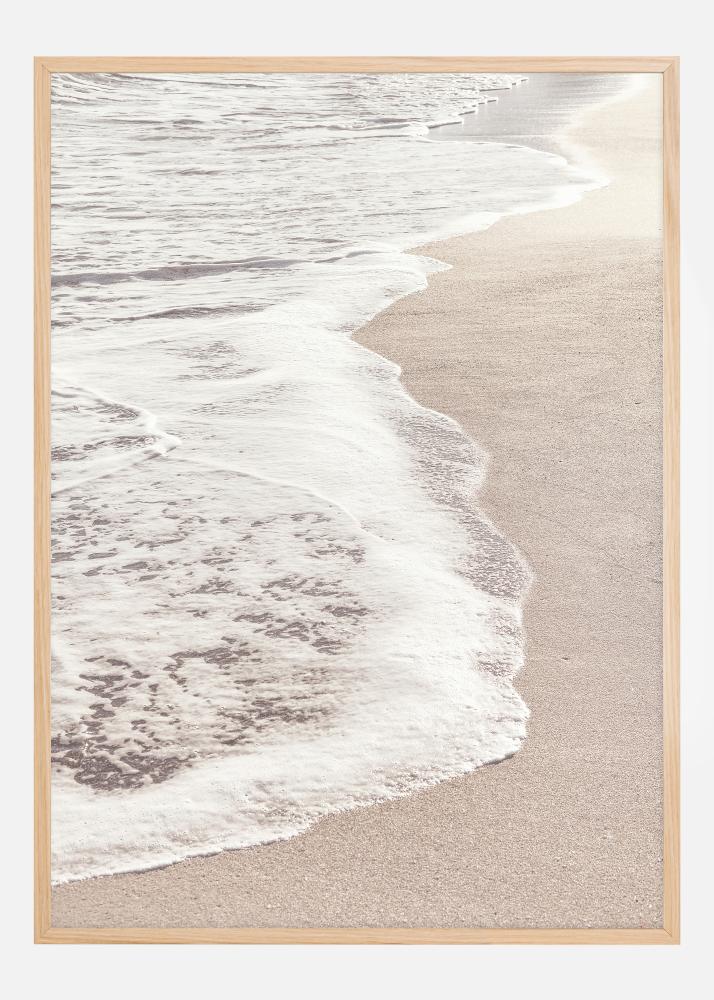 Táto náladová plagát opisuje pokojný rytmus morských vĺn, ktoré sa pomaly valia na zlatistú piesočnatú pláž. Harmonický prechod od vody k súši zachytáva večný cyklus mora a tichú krásu pobrežnej krajiny. Mäkké, neutrálne farby plagátu a jemné vzory peny na piesku vytvárajú pocit pokoja a nadčasového spojenia s prírodou.