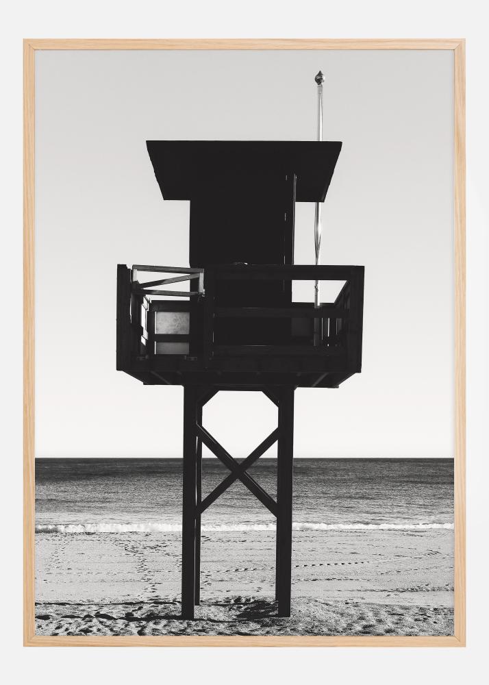 Táto monofarebná plagátová tlač predstavuje ikonickú siluetu plážovej veže na pozadí jasnej oblohy a pokojného mora. Silný kontrast medzi tmavou plážovou vežou a svetlými tónmi piesku a oblohy dodáva obrazu grafickú kvalitu, ktorá je úchvatná a moderná zároveň. Obraz, ktorý bol nasnímaný vo výške očí, vytvára pocit prítomnosti a pokoja, ako keby ste stáli priamo na pláži a pozerali sa na rozľahlé more.