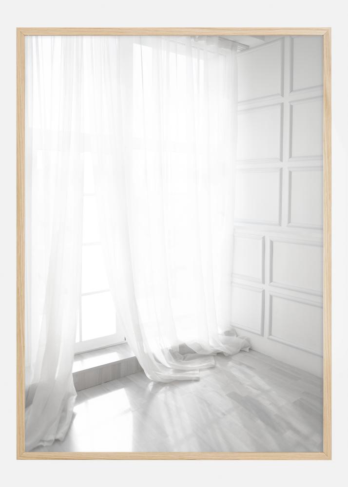 Tento pokojný a očistný plagát zobrazuje tiché zákutie miestnosti zahalené priehľadnými bielymi záclonami. Svetlo prenikajúce cez látku vytvára hru tieňov a odtieňov na lesklej podlahe, čo dáva pocit pokojnosti a jasnosti. Táto minimalistická tlač je vyjadrením ticha a dokonale by sa hodila do prostredia, ktoré usiluje o jednoduchosť a pokoj.
