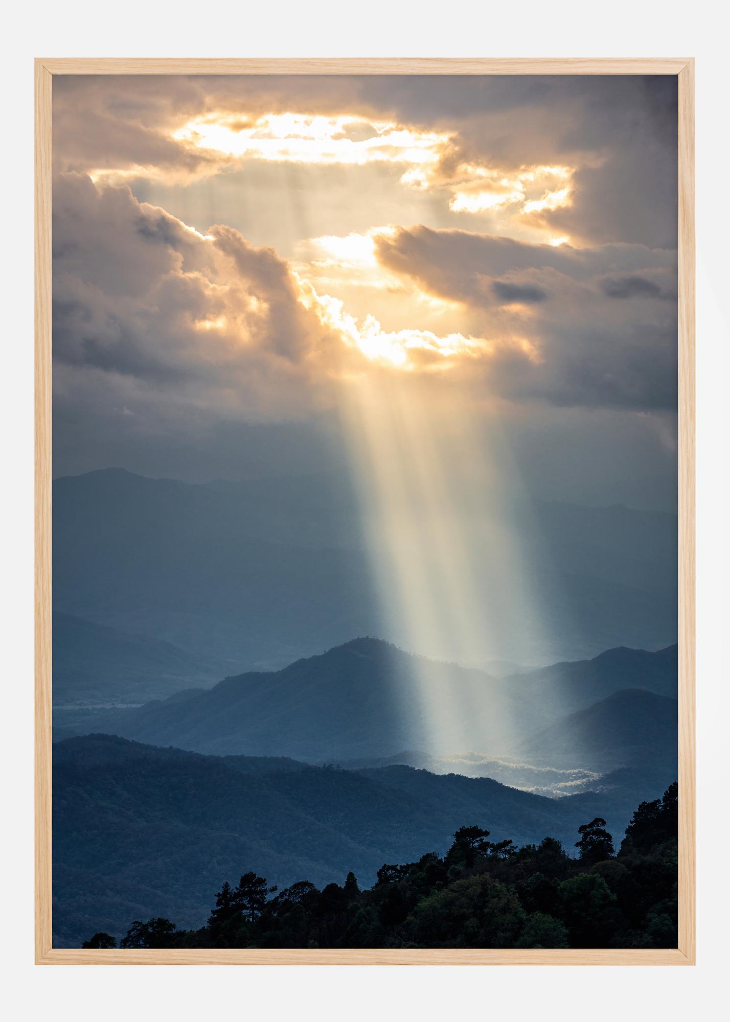 Táto inšpirujúca plagát zobrazuje majestátne krajinu, kde slnečné lúče prenikajú cez oblaky a osvetľujú vlnité hory. Je to scéna, ktorá zachytáva vznešenú krásu prírody, s dramatickou oblohou, ktorá kontrastuje s jemne tvarovanými horami. Tiene a svetlo sa hrajú nad krajinou a vytvárajú silný pocit hĺbky a priestoru.
