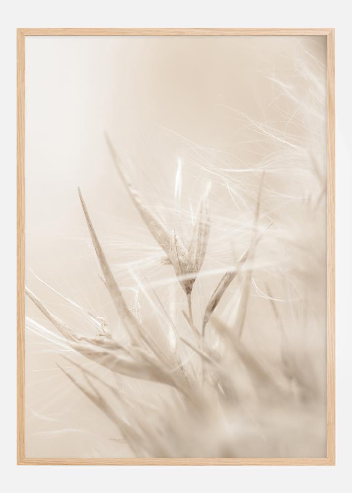 Tento plagát je štúdiou krehkosti a sily, detailným pohľadom na odpočívajúci rastlinný život, ktorého detaily a textúry sú zachytené v okamihu ticha. Jemný béžový farebný odtieň a jemné detaily suchých stebiel vytvárajú snovú atmosféru, ktorá je zároveň relaxačná a esteticky príťažlivá. Toto umelecké dielo zachytáva nádherné kontrasty prírody tým, že zvýrazňuje jej jemnú, ale zároveň odolnú povahu.