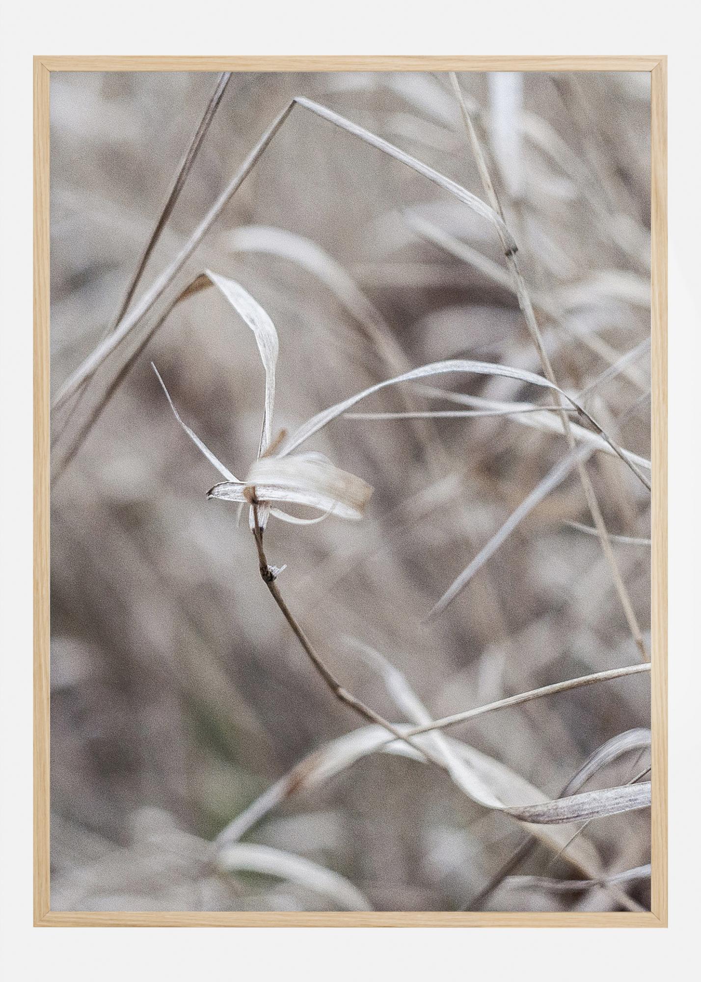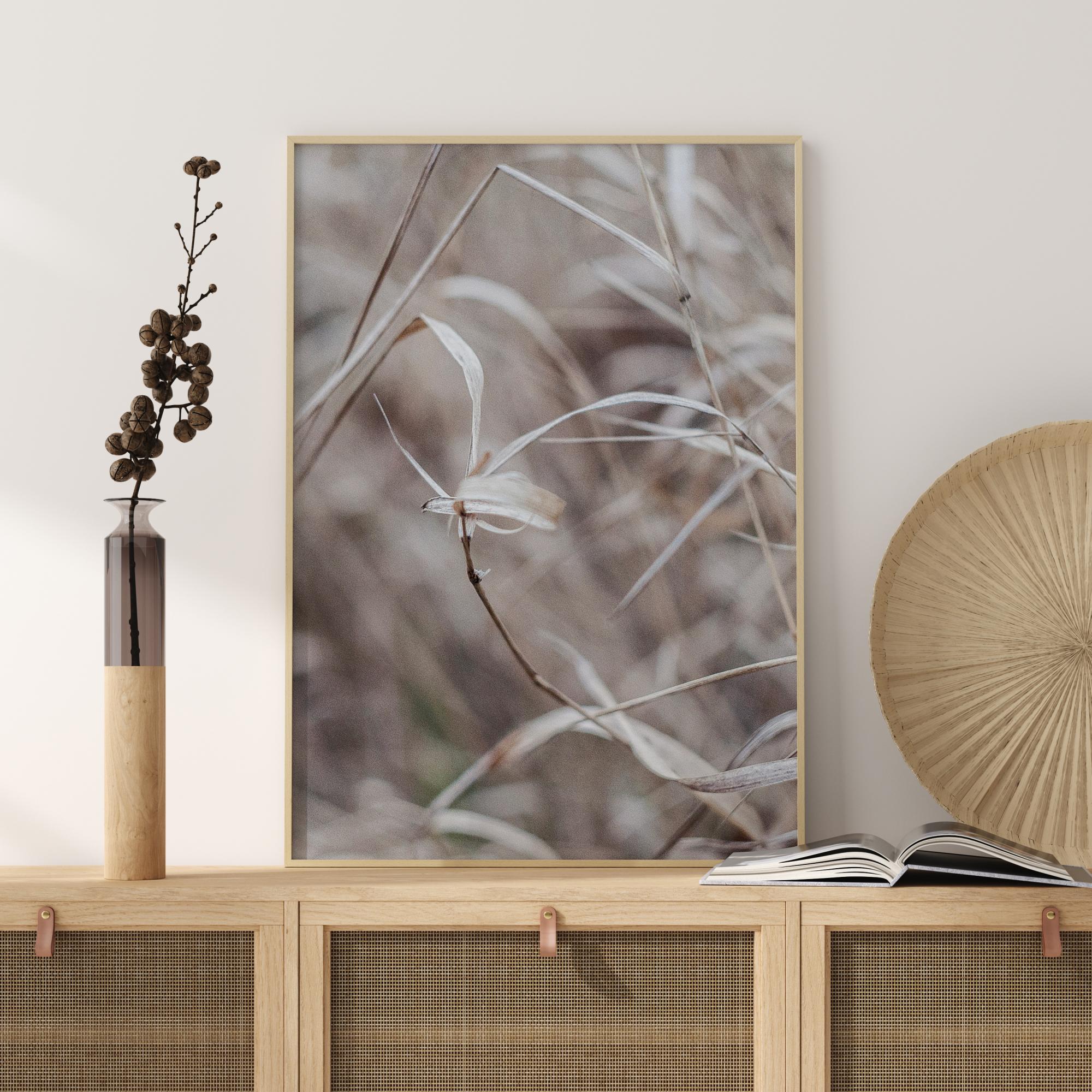 Elegantný prírodný plagát s jemnými listami zblízka. Jemné stonky a listy vedú pohľad okolo diela. Pocit hĺbky vzniká vďaka tomu, že pozadie je mimo zamerania. Zaveste tento obrázok na svetlú jednofarebnú stenu, aby jemné neutrálné pastelové farby vynikli.