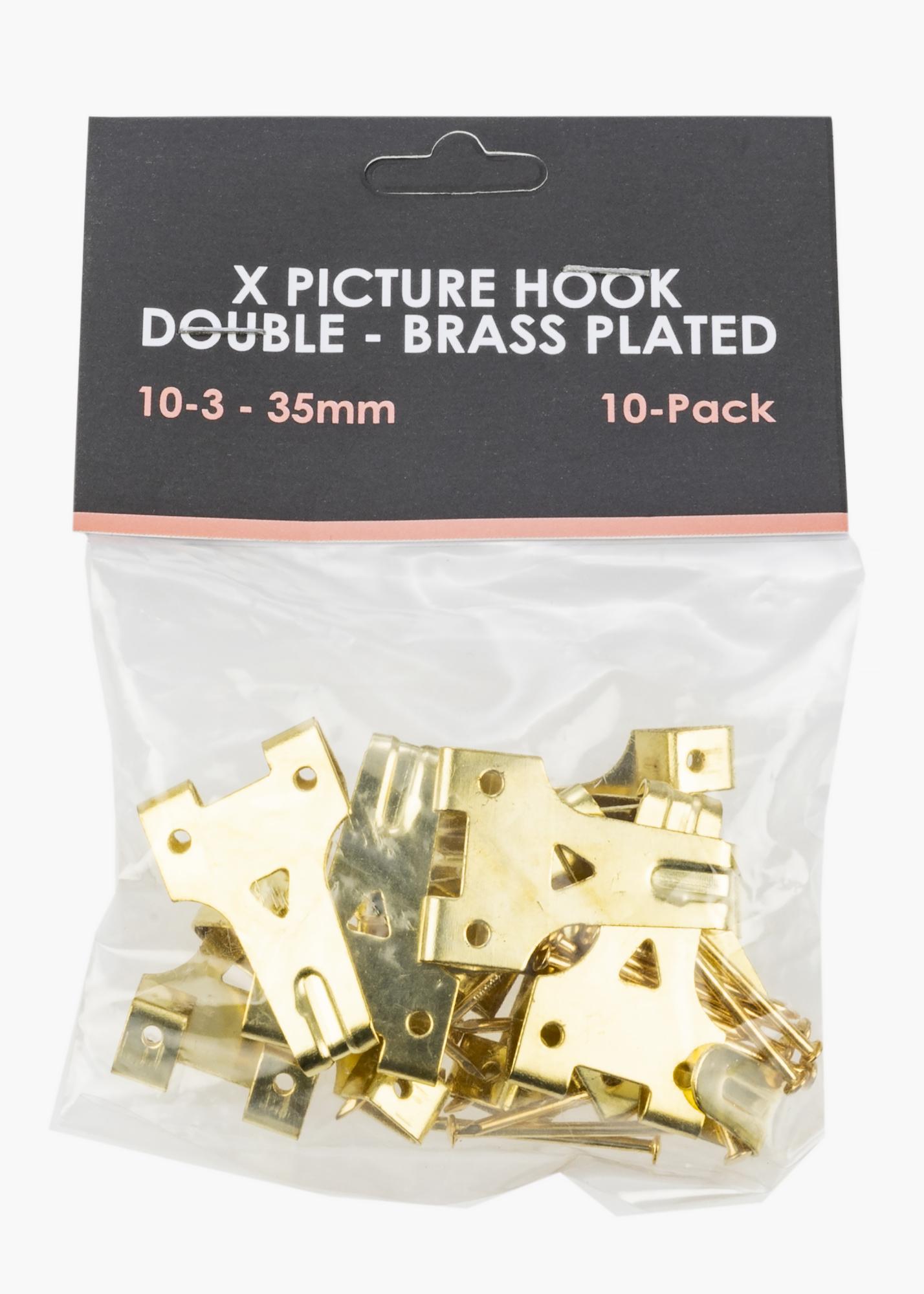 Dvojitý X-hák na montáž na drevené alebo sadrokartónové steny. Zvládne zaťaženie až do 10 kg. Mosadzná farba.