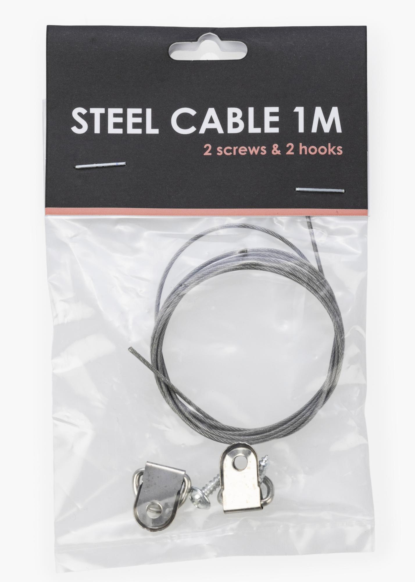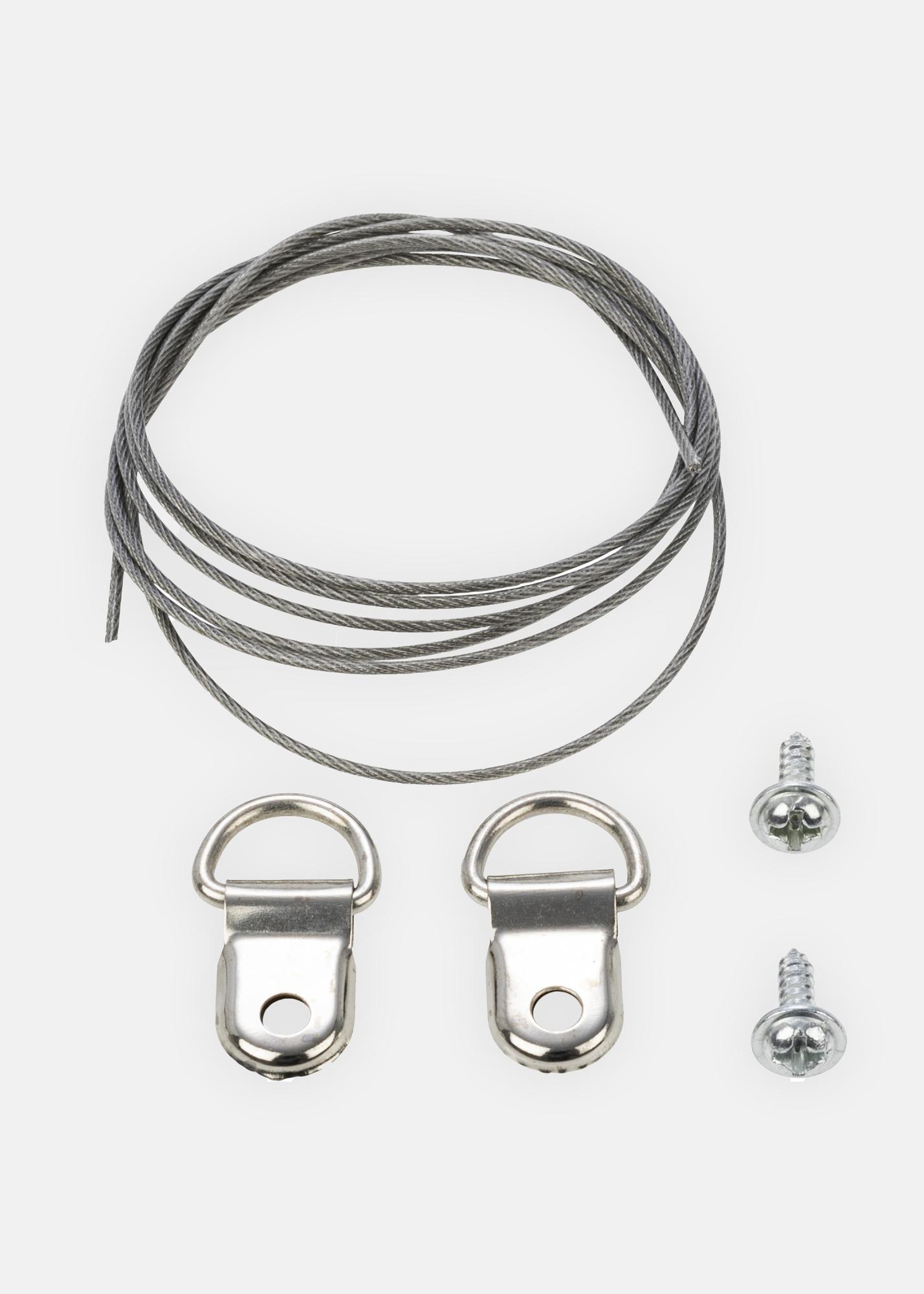 S týmto kompletným súpravou máte všetko, čo potrebujete na namontovanie oceľového lana na váš obraz: 1 meter dlhé oceľové lano, 2 skrutky a 2 očká/háky. Oceľové lano je pozinkované a odolné, ale len 0,7 mm hrubé, čo umožňuje jednoduchú manipuláciu, keďže sa môže ohýbať a splietať podľa želania.