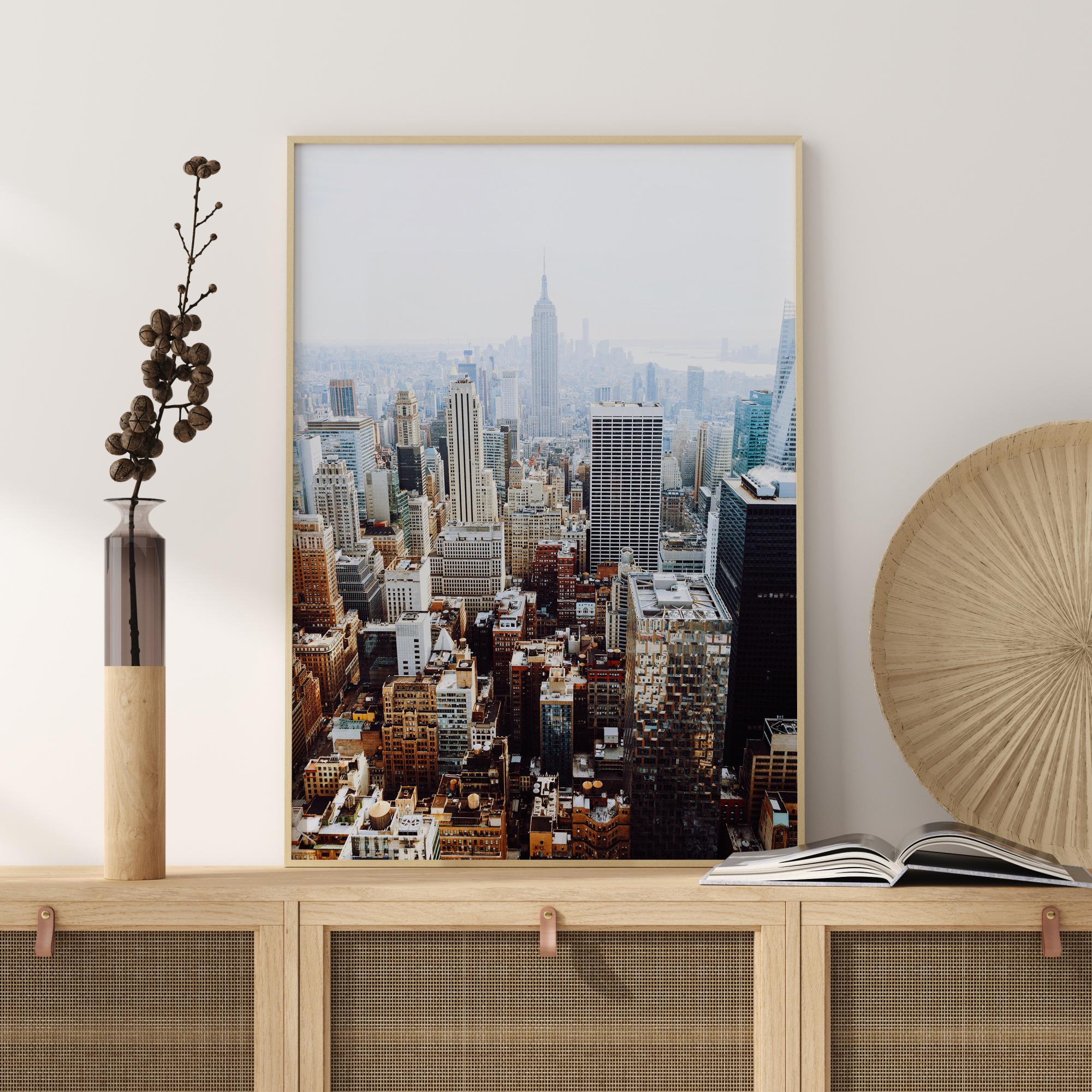 Letecký pohľad na centrum New Yorku s budovou Empire State Building v diaľke. V popredí začínajú farby ako zlaté a žlté, ktoré sa na pozadí miešajú do chladnejších modrých a sivých tónov. Je to znižujúce sa zaostrenie obrazu, ktoré vytvára hĺbku. Prineste toto dielo domov a vychutnajte si umelecký výraz mestského života.