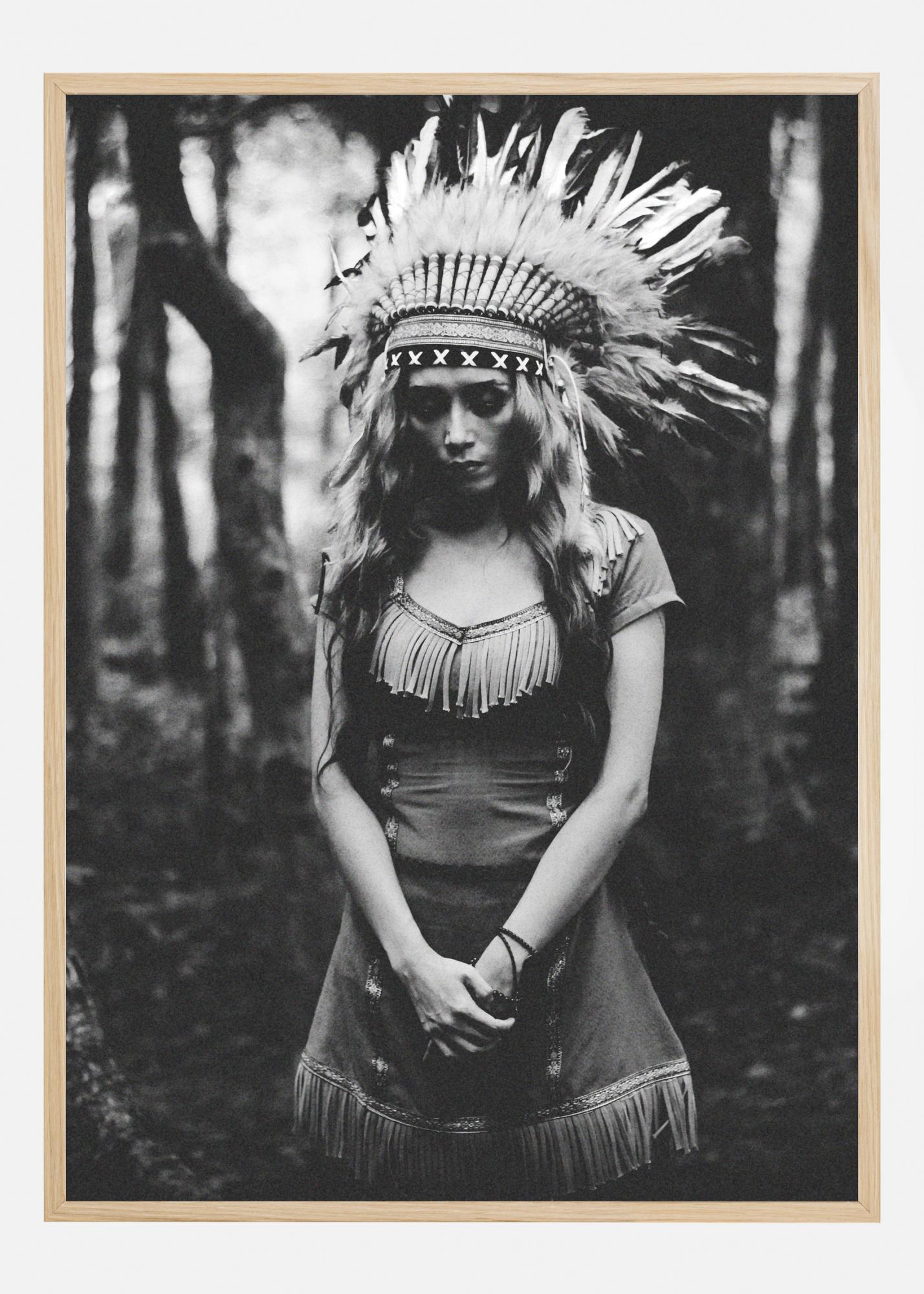 Portrétový plagát s indiánskym dievčaťom v lese. Tento silný čiernobiely obraz umožňuje bielym perám na čelenke vyniknúť voči tmavému kmeňu stromu. Nechajte sa uniesť do zamysleného okamihu, keď sklopí zrak na svoje prepletené ruky.