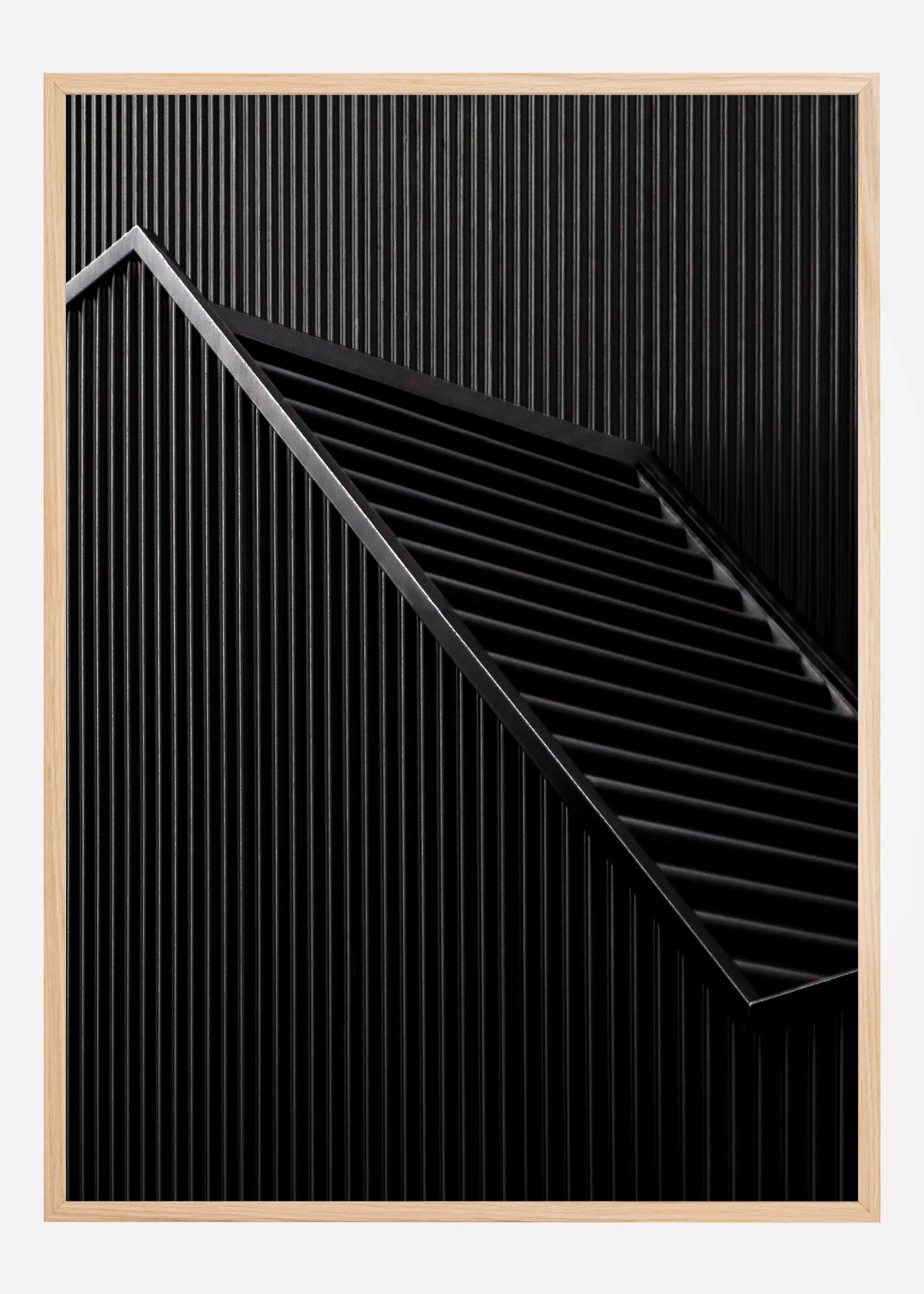 Geometrický plagát so súborom schodov alebo strechy proti stene. Táto čiernobiela fotografia pripomína obraz od Eschera. Sledujte línie v dreve, keď rezy tvoria rôzne uhly okolo diela pre úžasné predstavenie. Umiestnite tento obraz na bielu stenu pre ešte dramatickejší efekt.