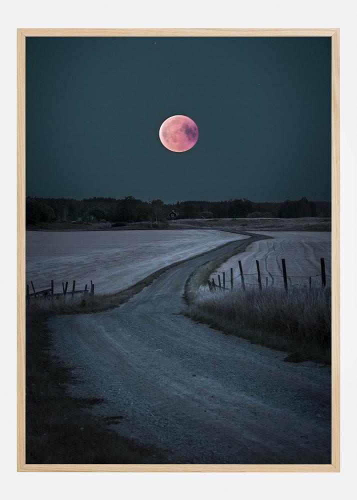 Fantastický plagát so zasneženou krajinou a svetlou červenou krvavou mesiacom v strede. Cesta vedie do diaľky a priťahuje pohľad k mesiacu, ktorý je nízko na oblohe. Sivá a modrá stoja v kontraste proti červenej a ružovej mesiaca, aby vytvorili pocit úcty v tomto nočnom obraze.